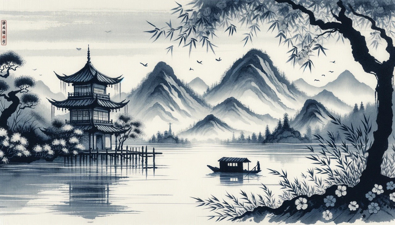 Deze Japanse landschapsbehang vangt de etherische schoonheid van traditionele inkttekeningen, met een majestueuze drie verdiepingen tellende pagode die oprijst naast rustige wateren. Mistige blauwgrijze bergen strekken zich uit over de horizon, terwijl delicate bamboebladeren het tafereel van boven omlijsten. Het monochromatische palet in verschillende tinten indigo creëert een serene sfeer, versterkt door de subtiele silhouetten van vogels die door de bewolkte lucht zweven.