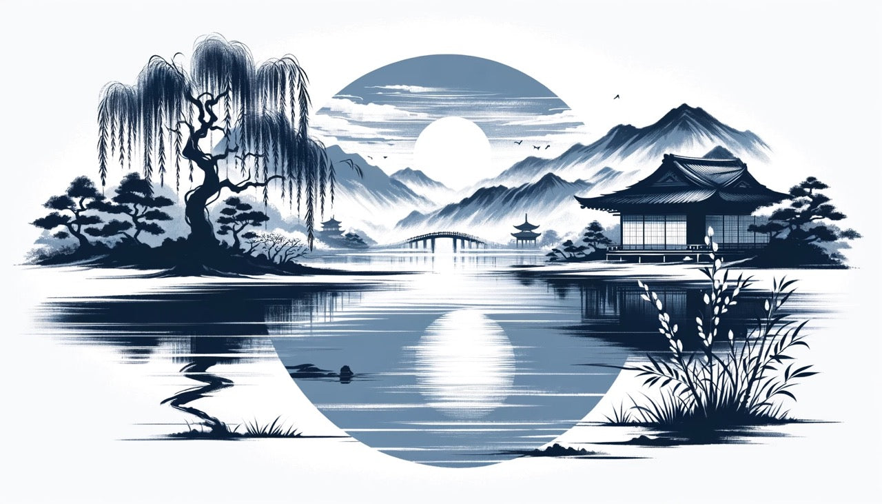 Deze Japanse landschapsbehang vangt de essentie van traditionele Aziatische kunst in een betoverend monochroom palet. Een majestueuze treurwilg staat als wachter naast een rustige meer, zijn sierlijke takken dansen in harmonie met de schilderachtige compositie. De evenwichtige opstelling bevat verre bergbehang pieken, traditionele paviljoens en een boogbrug, allemaal verenigd onder een dramatische cirkelvormige maan die de hemel beheerst.