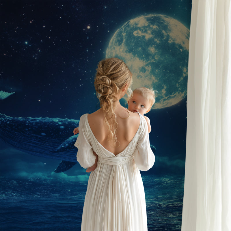 Verander elke ruimte in een rijk van verwondering met deze maanlicht walvismuur. Of het nu een kinderkamer, slaapkamer van kinderen of speelkamer siert, dit dromerige nachtelijke hemelbehang creëert een sfeer van rustige avontuur en grenzeloze verbeelding. De zachte mix van maritieme en hemelse elementen biedt een rustgevende maar boeiende achtergrond die dromen aanmoedigt en creativiteit voedt.
