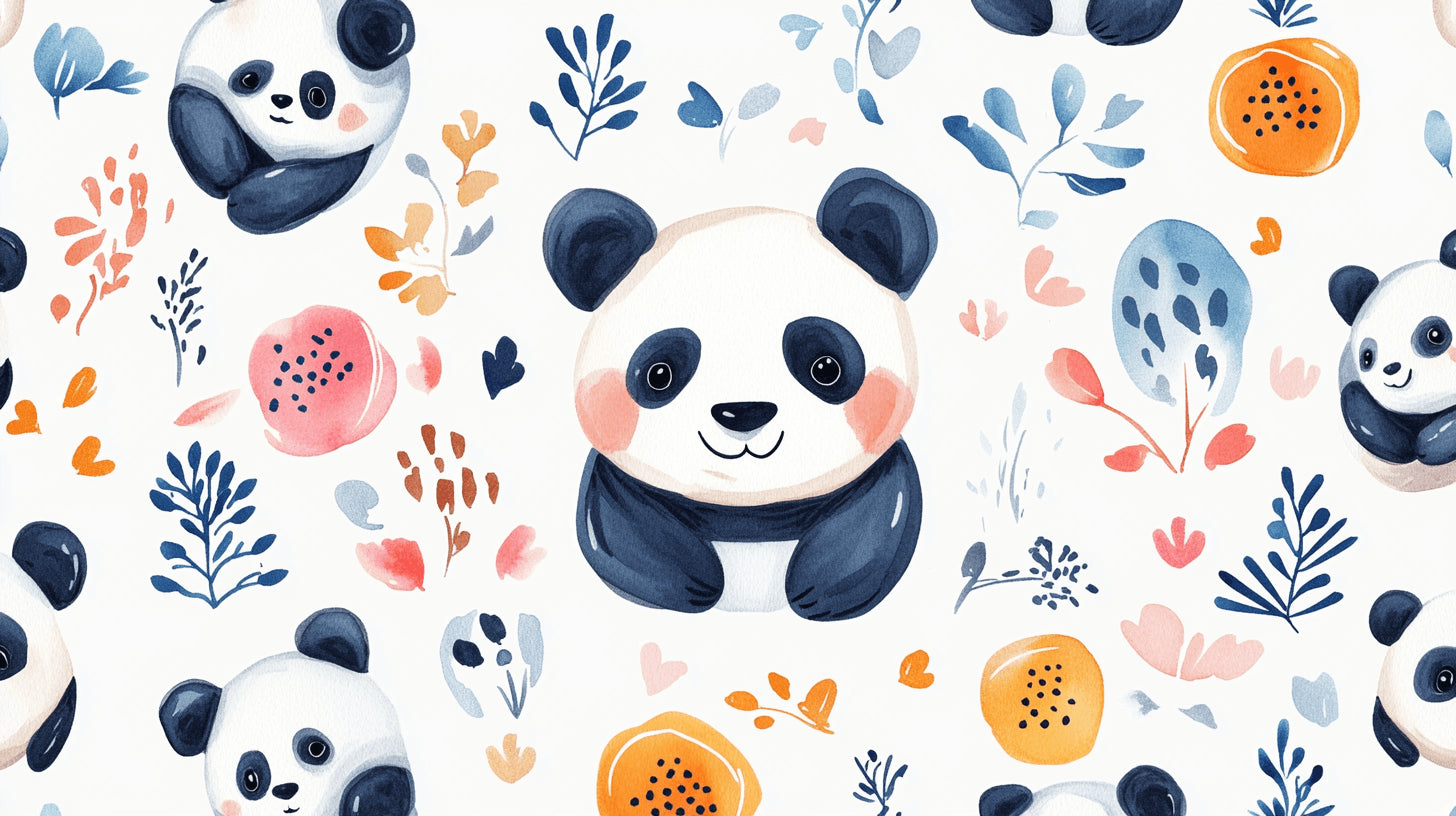 Deze charmante panda behang toont schattige panda karakters weergegeven in een heerlijke aquarel stijl tegen een serene witte achtergrond. Het ontwerp bevat speelse panda's met roze wangen en expressieve ogen, omringd door een betoverende reeks bloemmotieven in marineblauw, zacht koraal en warme oranje tinten. Het aquarel dierenbehang creëert een perfecte balans tussen speelse karakterkunst en elegante botanische motieven.