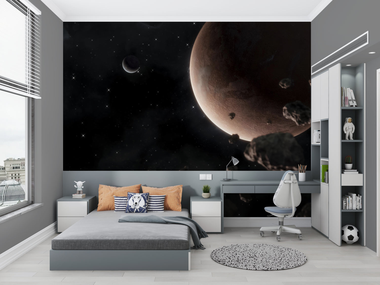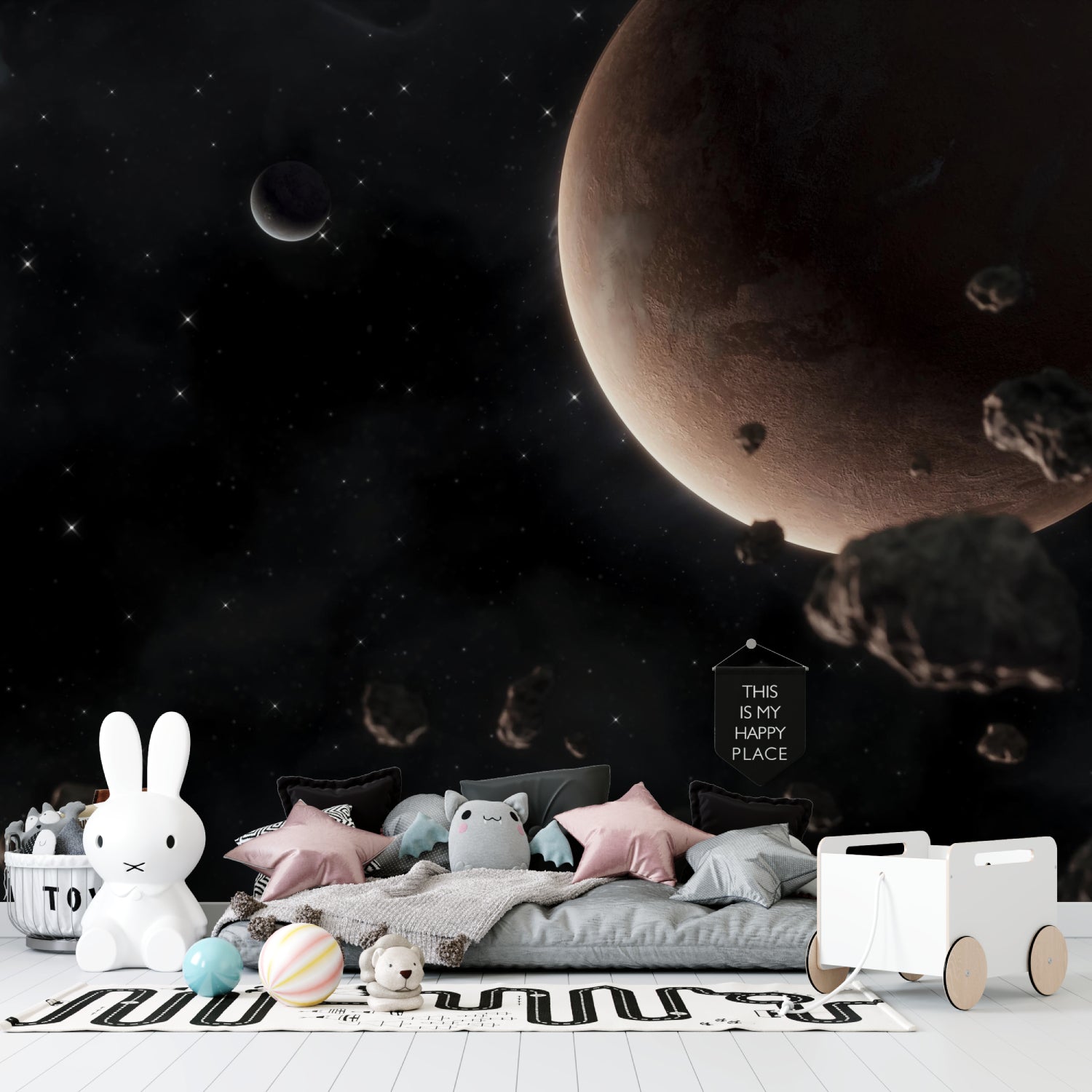 Deze ruimte muurschildering toont een adembenemend hemels landschap met een majestueuze roodbruine planeet die het donkere heelal domineert. Het ontwerp vangt de ingewikkelde details van sterrenlichamen, met fonkelende sterren verspreid over de diepe zwarte uitgestrektheid en rondcirkelende manen die een boeiend astronomisch tafereel creëren. De kosmische muurschildering presenteert een authentieke weergave van de ruimte met zijn gedetailleerde asteroïdeformaties en rijke planetaire texturen.