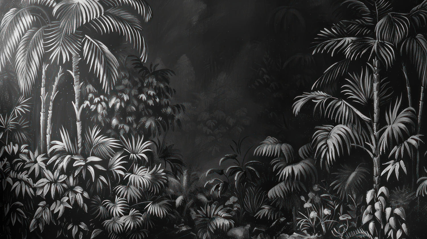 Deze tropische palmbehang creëert een verfijnd toevluchtsoord met zijn dramatische monochrome ontwerp. De donkere achtergrond dient als een canvas voor etherische zilver-witte palmbladeren, die lagen van diepte en mysterie creëren. Elk detail van het exotische bladerenbehang is zorgvuldig weergegeven, van de vloeiende bogen van volwassen palmen tot de delicate texturen van tropische bladeren, die samen een betoverend botanisch tableau vormen.