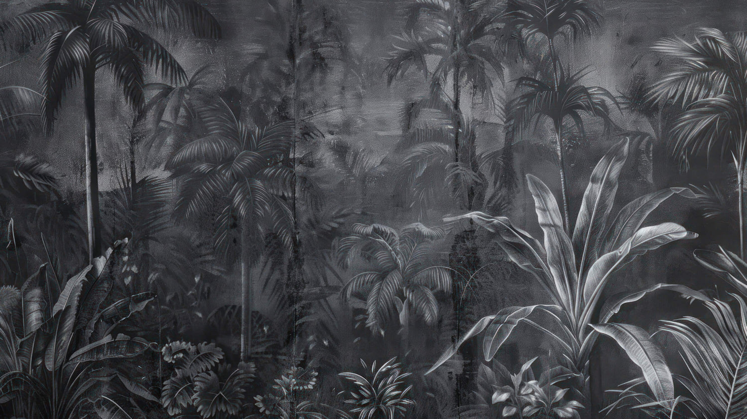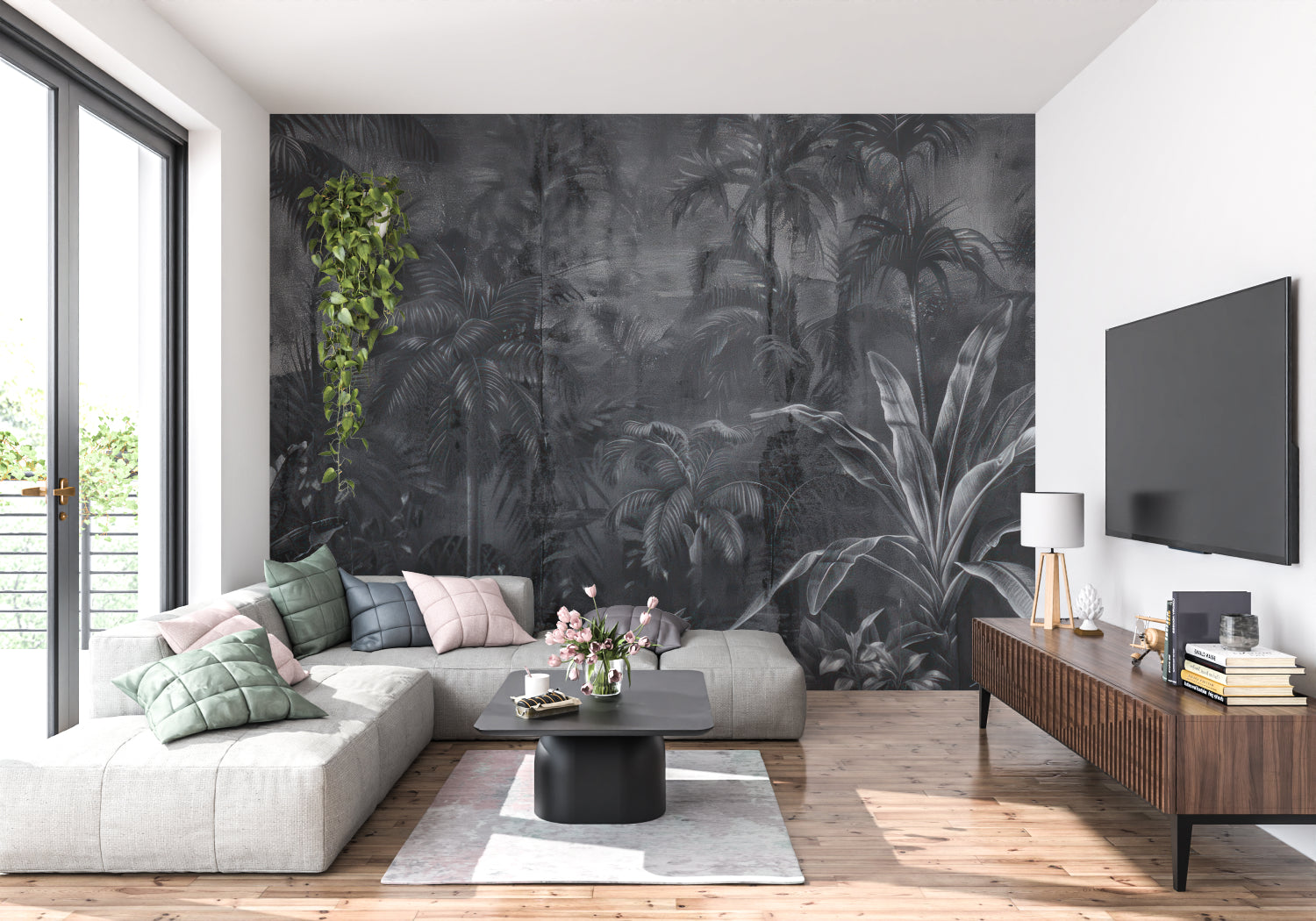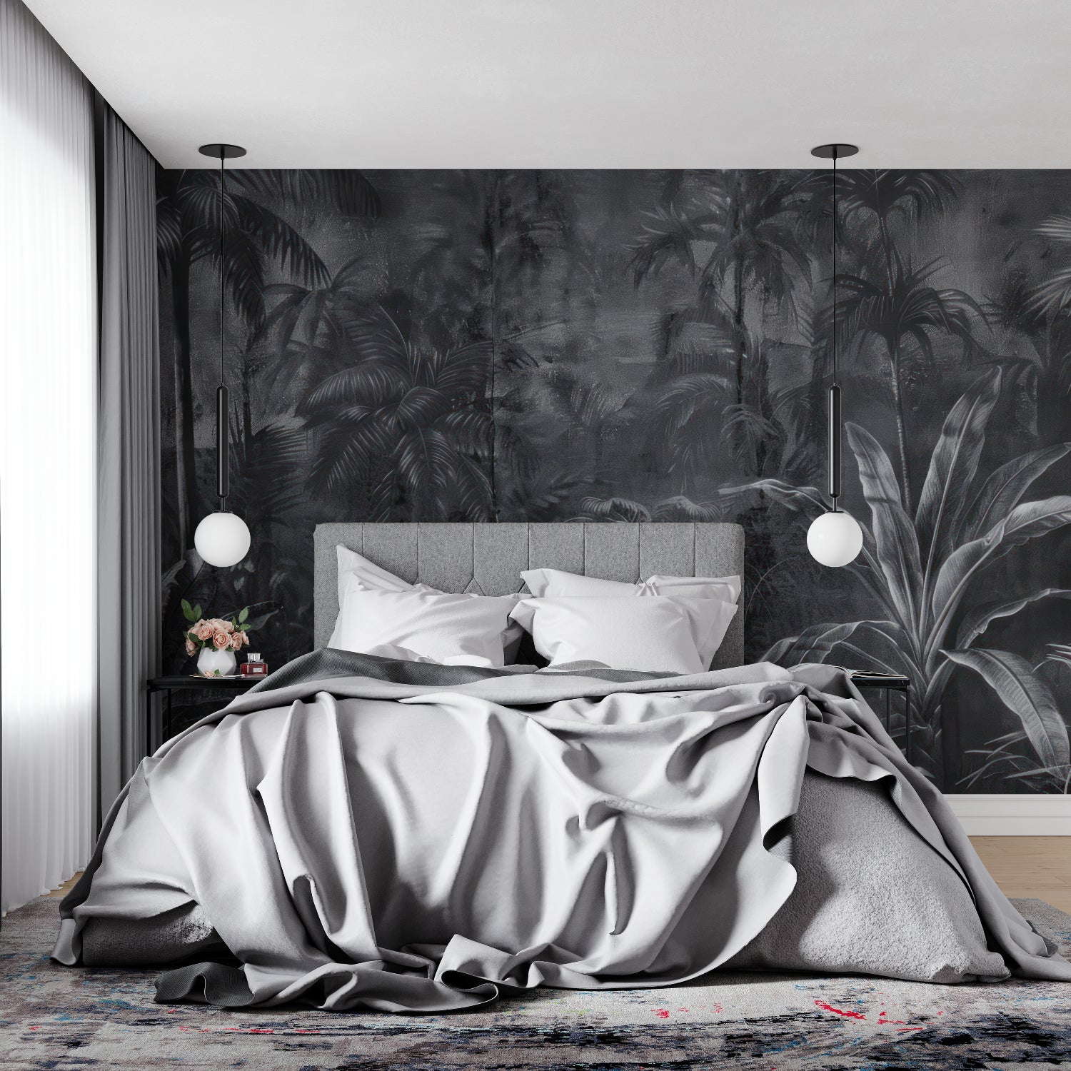 Deze tropische palmbehang presenteert een verfijnde verkenning van schaduw en vorm, waarbij diepe houtskoolkleurige palmbladeren een betoverende diepte creëren tegen een mysterieuze donkere achtergrond. De monochrome jungle muurschildering bevat een kunstzinnige rangschikking van bananenbladeren en tropische palmen, weergegeven in verschillende tinten grijs en zwart, wat een sfeer van verfijde wildernis en hedendaagse elegantie creëert.
