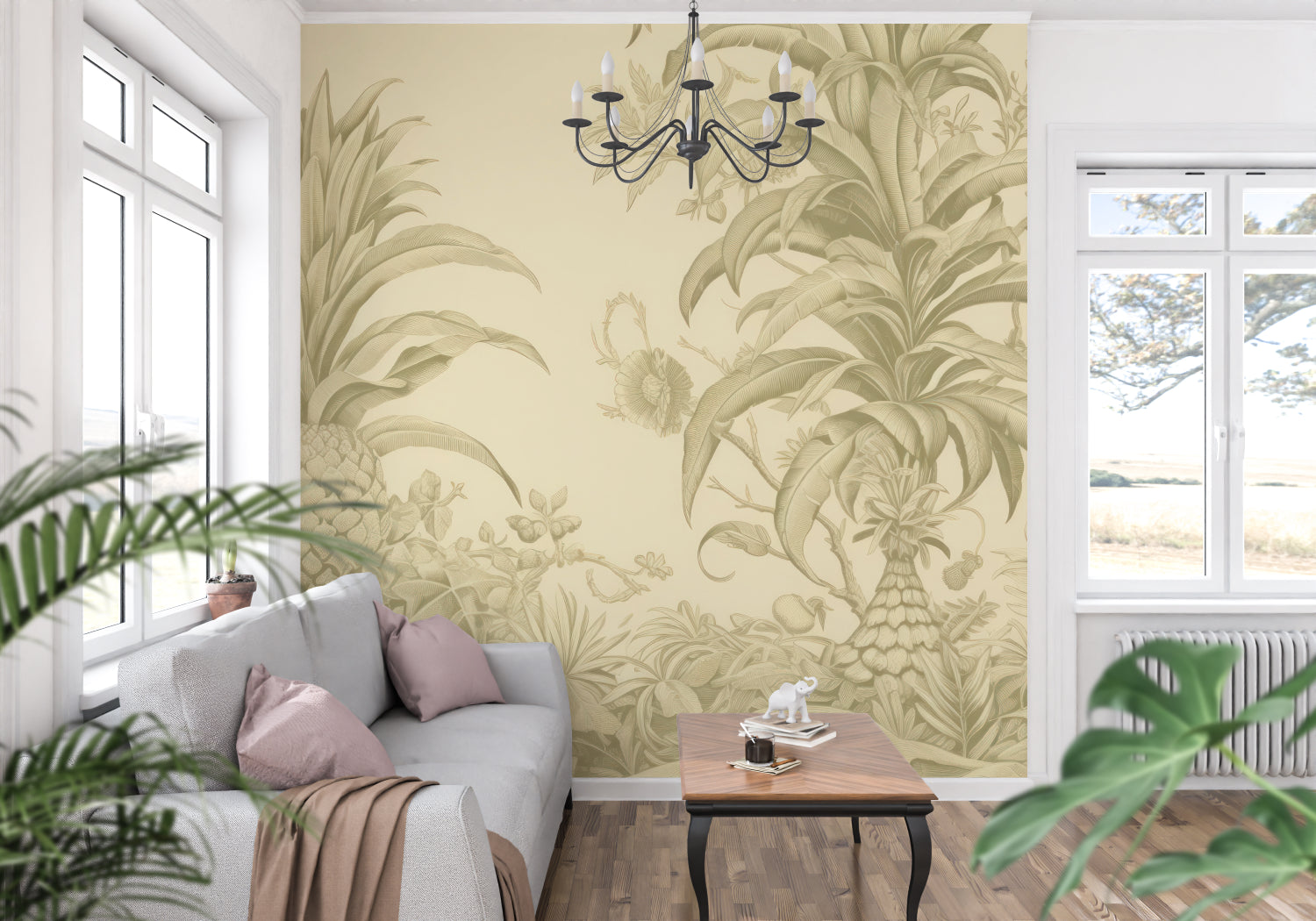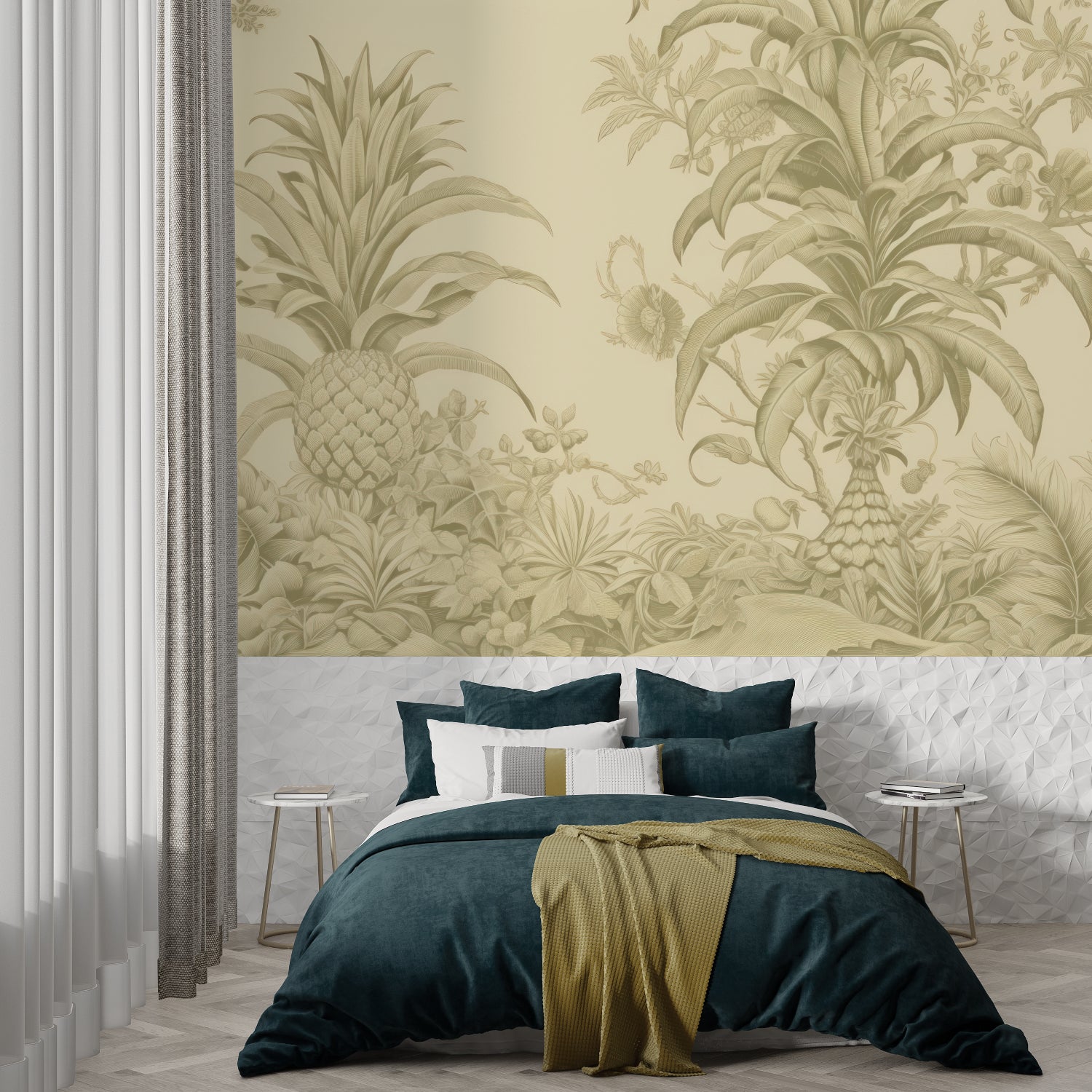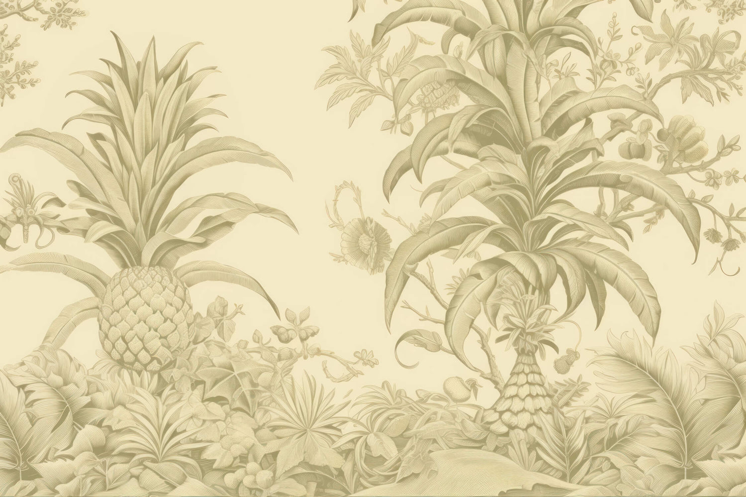 Deze tropische ananas behang toont een elegante interpretatie van klassieke Toile de Jouy kunst. Uitgevoerd in zachte beige tinten, bevat het verfijnde ontwerp sierlijke palmbladeren en gedetailleerde ananasmotieven die over het oppervlak dansen. De botanische muurschildering combineert delicate lijntekeningen met luxueuze tropische elementen, wat een harmonieuze mix van traditionele techniek en exotische inspiratie creëert.