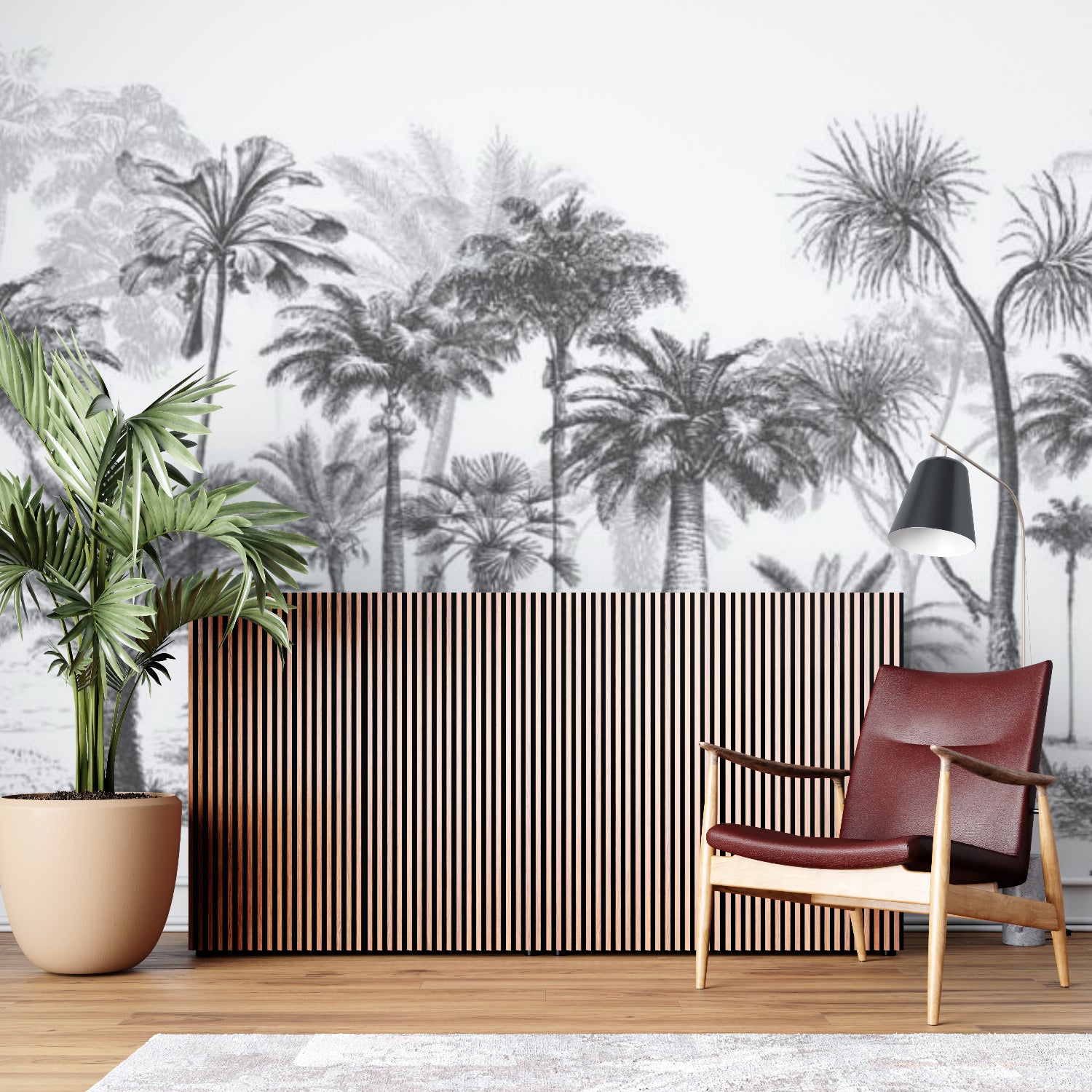 This black and white palm mural turns plain walls into stunning focal points.