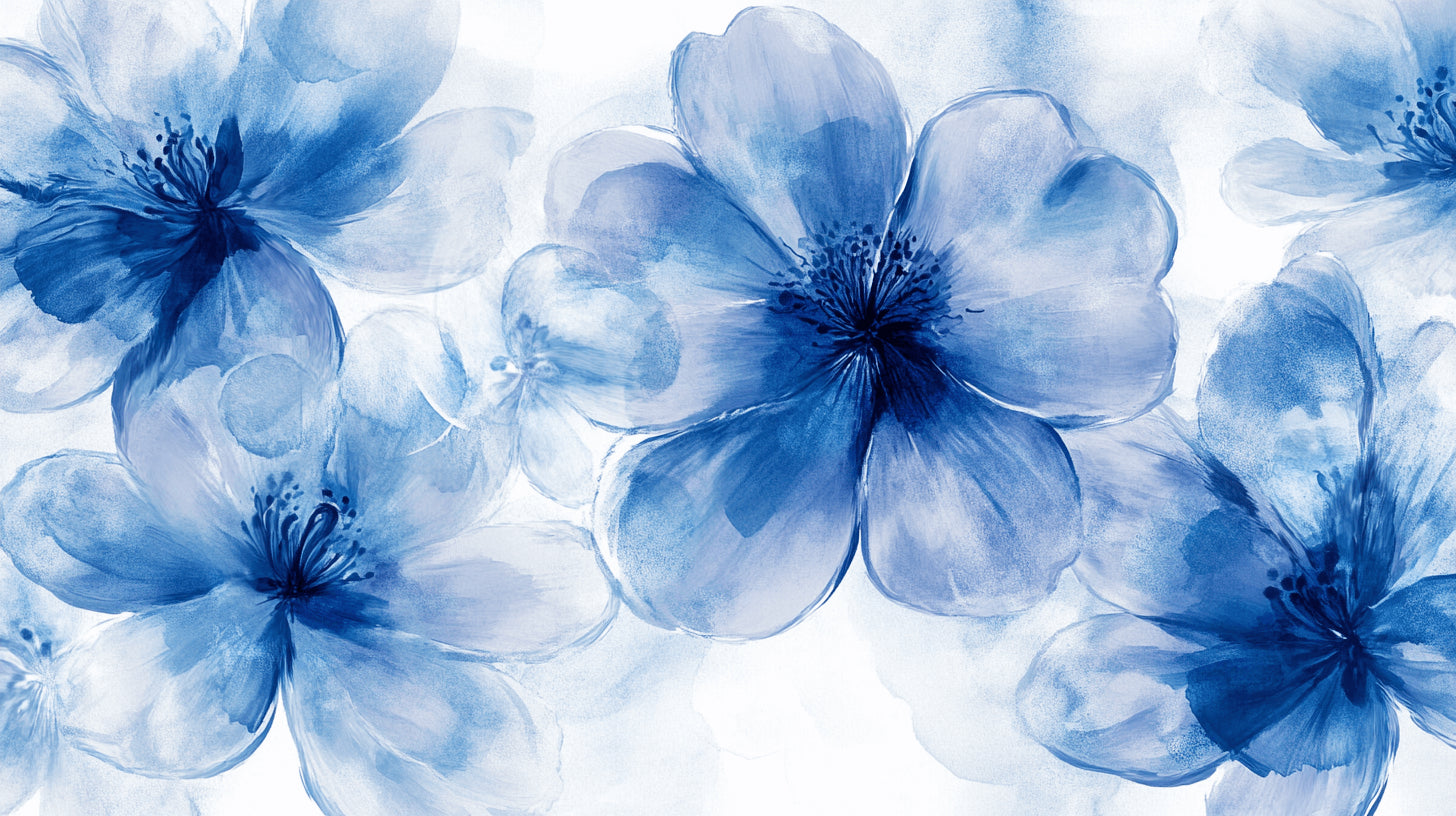 Denne blå blomstrete tapeten viser praktfulle overdimensjonerte blomster fremstilt i en eterisk akvarellteknikk. De delikate kronbladene går fra lys azurblå til dyp marineblå i midten, noe som skaper en fengslende dybdeeffekt. Hver akvarellblomst tapet-design flyter sømløst over i den neste, samtidig som den opprettholder en sofistikert hvit bakgrunn som fremhever den kunstneriske flyten i komposisjonen.