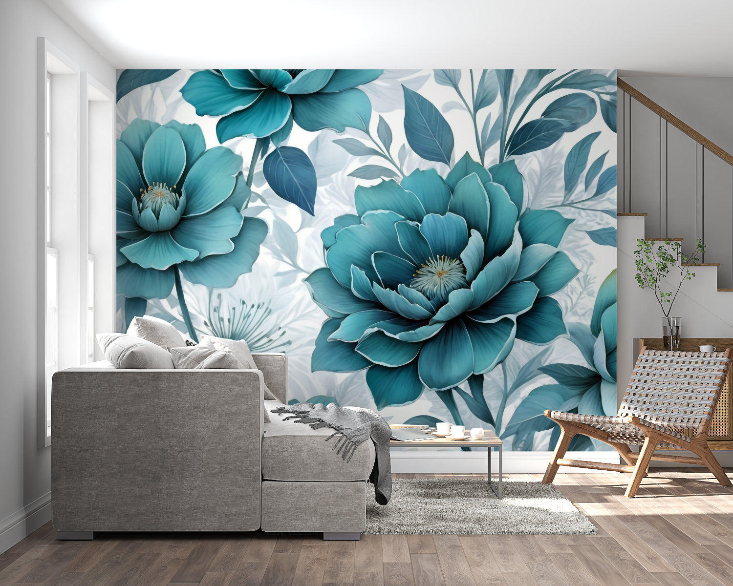 Denne blomstrete veggmaleriet viser praktfulle overdimensjonerte blomster i rike blågrønne toner mot en rolig hvit bakgrunn. De nøye detaljerte kronbladene skaper en tredimensjonal effekt, mens delikat løvverk i varierende nyanser av blågrønt vever seg grasiøst mellom det store blomsterdesignet. Hver blomst er gjengitt med eksepsjonell kunstnerisk dyktighet, med subtile graderinger og presis lagdeling som gir dybde og sofistikasjon til komposisjonen.