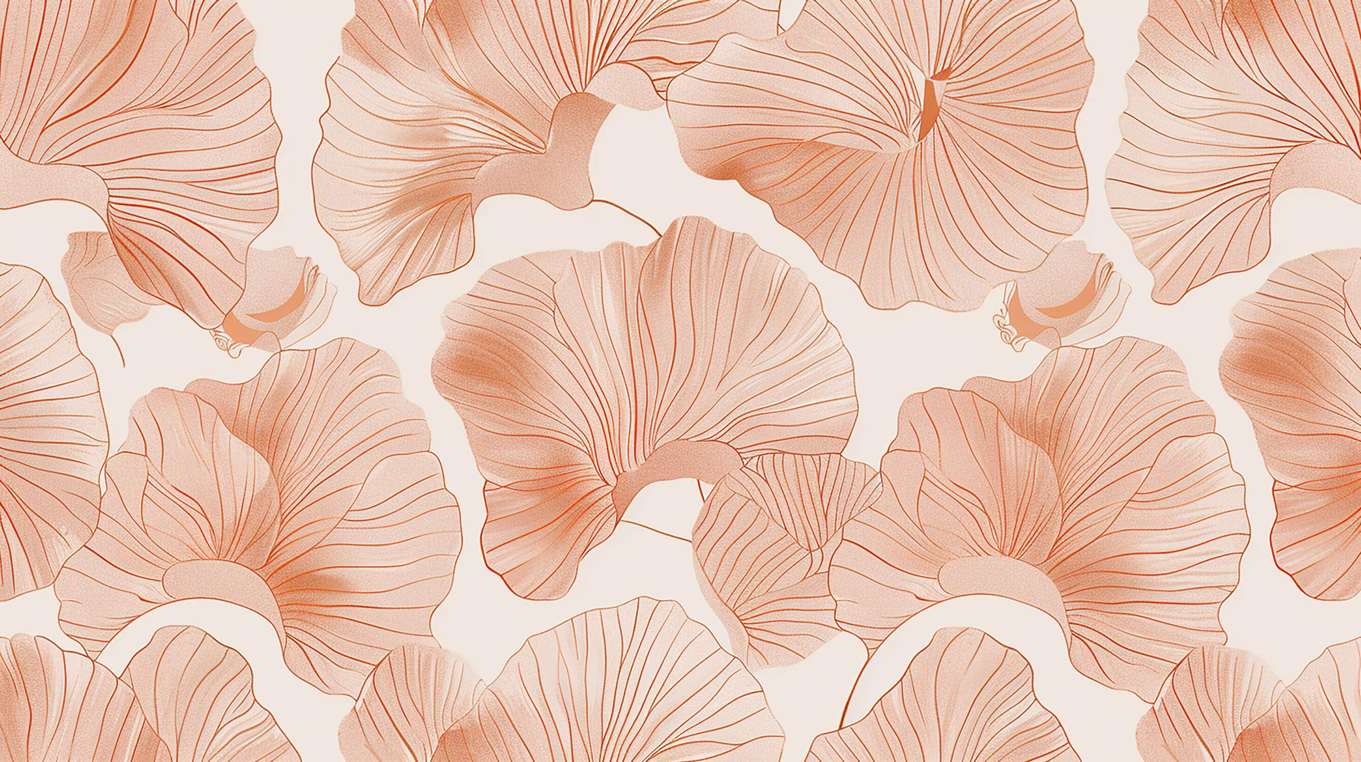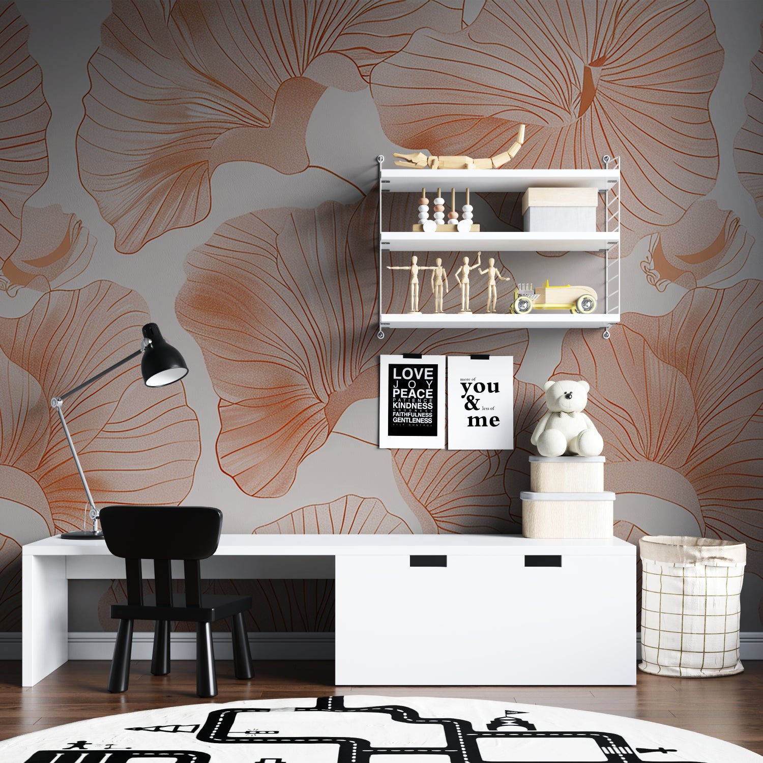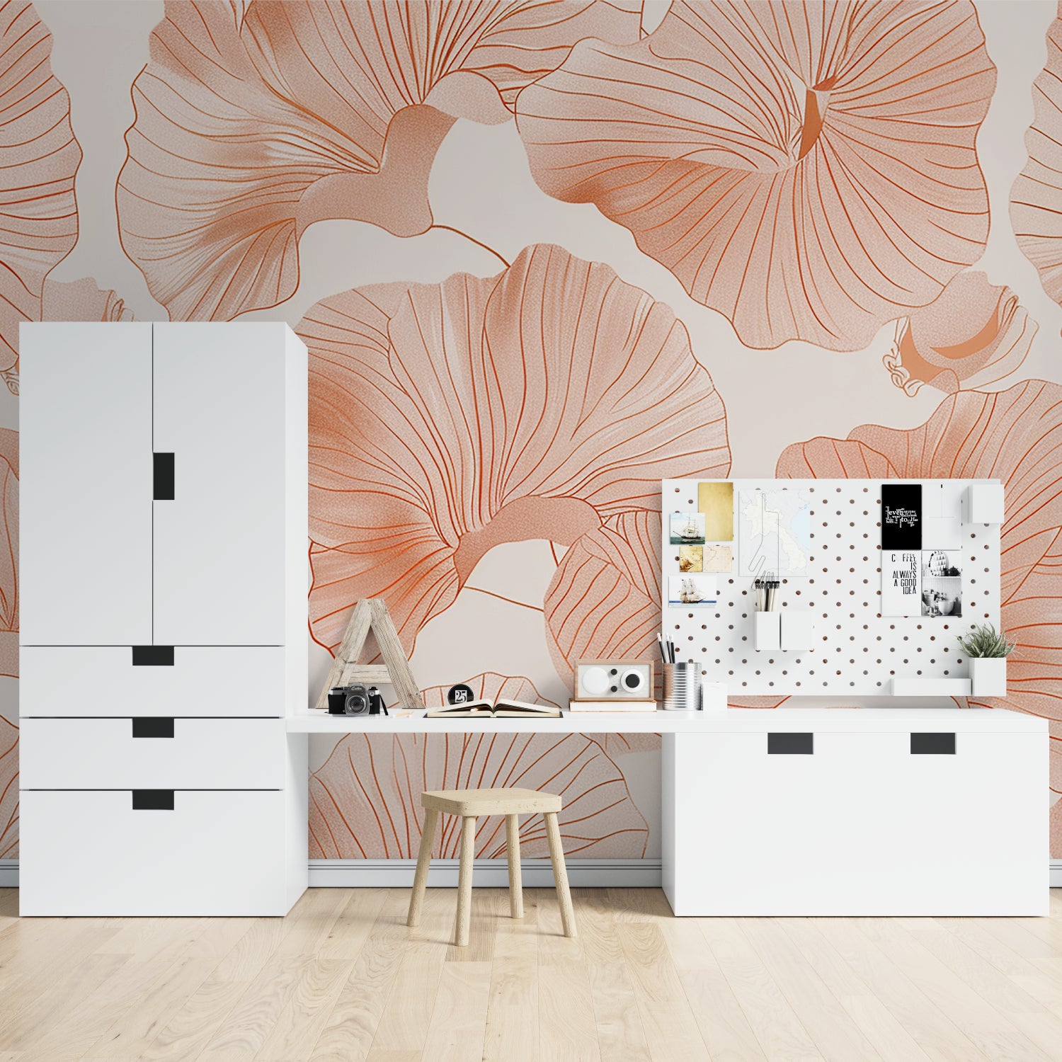 Denne store blomster tapeten viser et elegant arrangement av overdimensjonerte kronblader i en myk terrakottafarge mot en lys krembakgrunn. Det delikate linjearbeidet skaper en sofistikert botanisk veggmaleri hvor hvert kronblad folder seg ut med grasiøs presisjon, og viser intrikate årer som tilfører dybde og bevegelse til designet. De milde lakserosa tonene blander seg sømløst for å skape en varm, innbydende atmosfære som lyser opp ethvert rom.