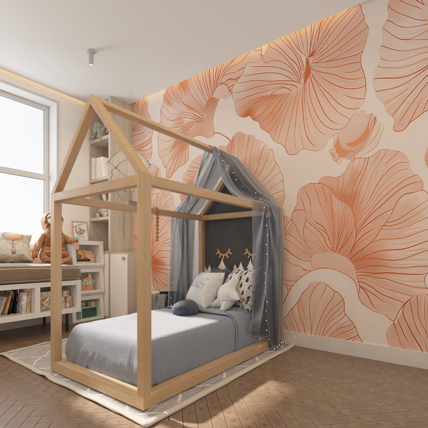 The delicate floral feature wall turns simple rooms into cozy retreats.