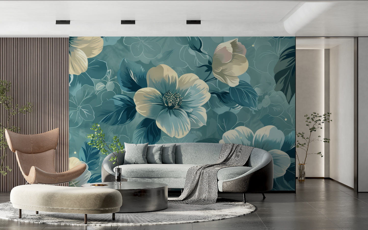 Denne blomstrete tapetmaleriet viser praktfulle, overdimensjonerte blomster i en harmonisk blanding av blågrønne og kremfargede toner. De store blomstene svever grasiøst mot en dyp blågrønn bakgrunn, med delikate kronblader i myke kremfarger. Hver blomst er kunstnerisk detaljert med subtile skygger og intrikate sentre, mens elegant løvverk skaper dybde og bevegelse over botanisk veggmaleri.