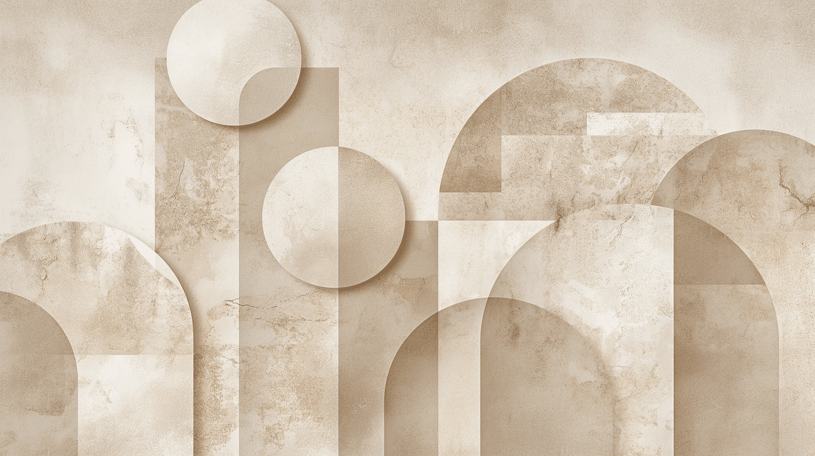 Denne geometriske abstrakte tapeten viser en sofistikert komposisjon av overlappende sirkler og buer mot en teksturert beige bakgrunn. Designet skaper et fengslende samspill av lys og skygge, med tredimensjonale former som ser ut til å sveve på overflaten. Den marmoraktige teksturen tilfører dybde til den moderne art deco-tapeten, mens den nøytrale paletten av krem og myke beige toner skaper en rolig, sofistikert atmosfære.