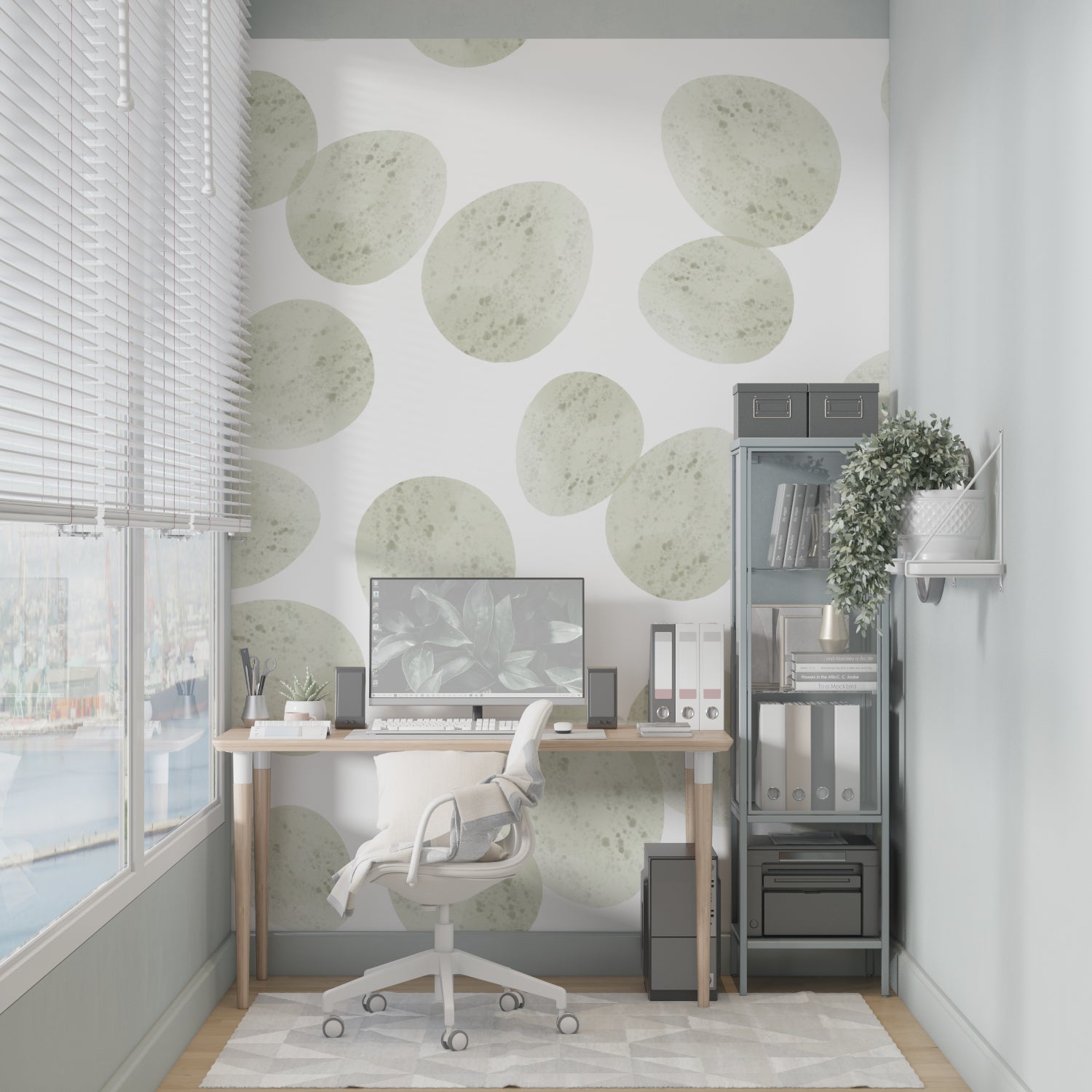 Denne moderne geometriske tapeten viser en elegant sammensetning av teksturerte sirkulære former i myke salviegrønne toner mot en ren hvit bakgrunn. Hver sirkel har subtile marmorerte effekter som tilfører dybde og sofistikasjon til mønsteret. Den milde, dempede paletten skaper en rolig rytme over veggen, mens den organiske teksturen i hver sirkel gir en naturlig, taktil kvalitet til denne moderne sirkel-tapeten.