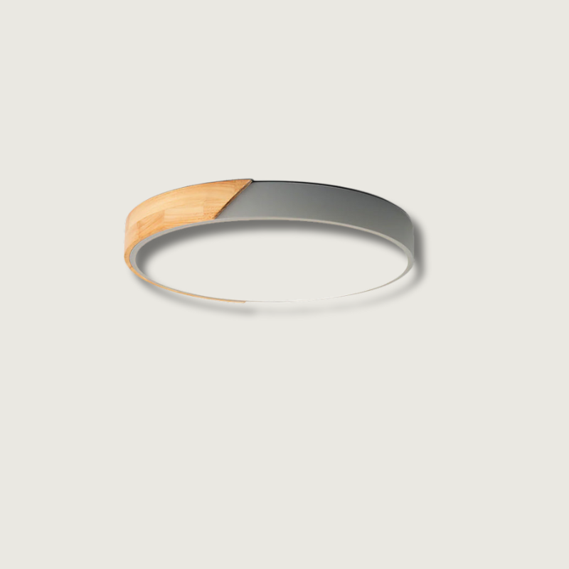 Denne moderne taklampen kombinerer minimalistisk design med naturlige elementer. Den runde taklampen har en blanding av grått metall og varme tre-aksenter, som skaper en raffinert kontrast som passer sømløst inn i moderne eller industrielle interiører. Det myke, diffuse lyset skaper en beroligende atmosfære, noe som gjør den til et ideelt valg for stuer, soverom eller inngangspartier.