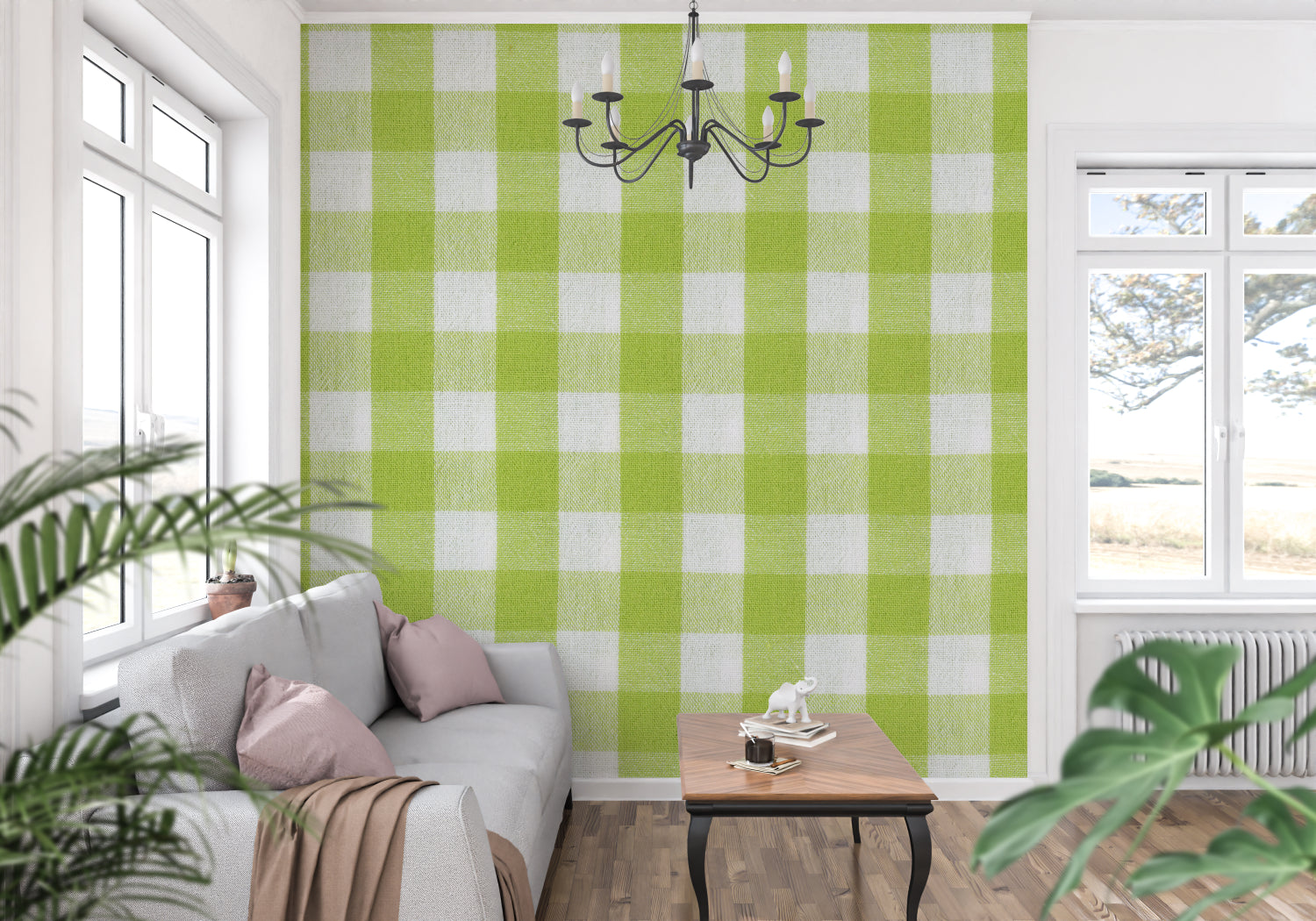 Denne rutete tapeten viser et friskt og livlig gingham-mønster i vårgrønt og krystallklart hvitt. De store rutene skaper en dristig geometrisk rytme over veggen, mens den teksturerte finishen tilfører dybde og varme til det klassiske mønster tapet-designet. Den harmoniske balansen mellom de to fargene gir en følelse av naturlig vitalitet, noe som gjør det til et slående visuelt element i ethvert rom.