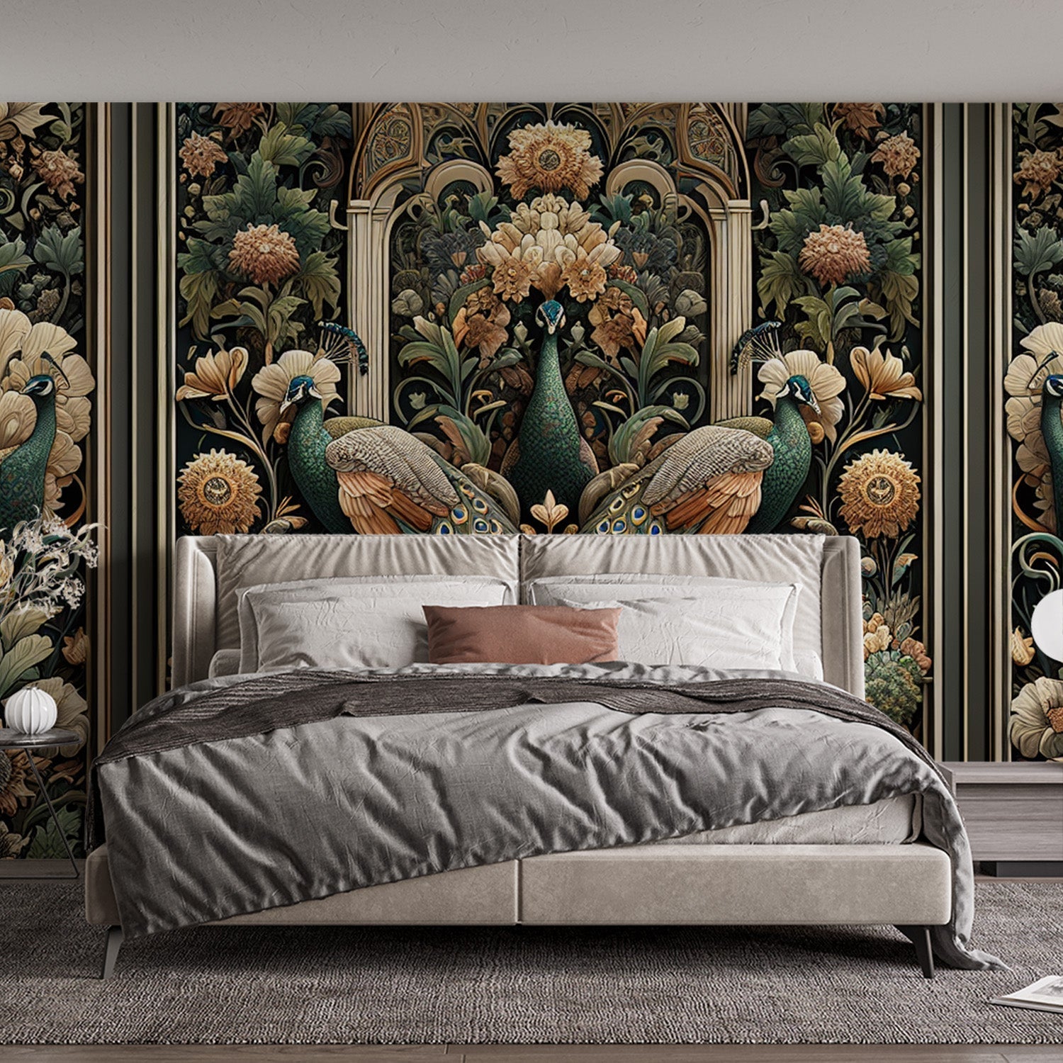 Denne påfuglmural tapeten viser en mesterlig Art Deco-komposisjon hvor smaragdgrønne påfugler hersker i kongelig prakt. Plassert innenfor utsmykkede gyldne buer, viser fuglene sin praktfulle fjærdrakt blant frodige botaniske elementer. Rike krysantemumblomster i varme kobbertone komplementerer det dype skoggrønne løvverket, mens vintage fugletapet-paneler skaper en sofistikert triptyk-effekt.