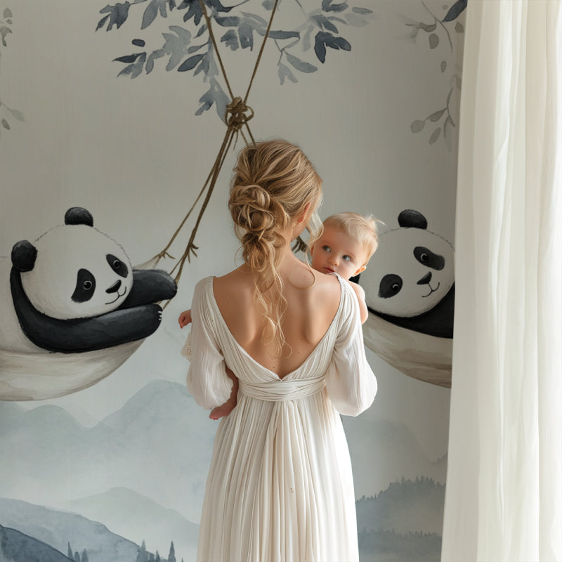 Denne fortryllende panda tapetmurale fanger en eventyrlig scene med to bedårende pandaer som slapper av i lerretshammocker mot en rolig fjellbakgrunn. Akvarellstil-illustrasjonen kombinerer myke blågrå fjell med delikat løvverk, og skaper en drømmende atmosfære. Den asiatiske bjørnetapeten viser den lekne naturen til disse elskede skapningene, gjengitt i klassiske svart-hvite toner som skiller seg ut mot det tåkete landskapet.