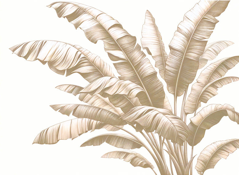 Denne tropiske løvverk tapetet viser en mesterlig gjengivelse av majestetiske bananblader i sofistikerte beige toner. Den nøye detaljerte botaniske illustrasjonen fanger hver vene og kurve av bladene, og skaper en følelse av dybde og bevegelse over veggen. Det beige blad tapetet har en elegant sepia-palett som bringer varme og raffinement til ethvert interiør, samtidig som det opprettholder en moderne, kunstnerisk tilnærming til naturlige elementer.