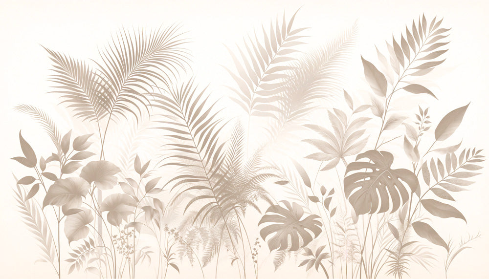 Denne tropiske løvverk tapeten viser en elegant komposisjon av palmeblader og monstera-blader gjengitt i sofistikerte beige toner. De delikate botaniske silhuettene skaper en lagdelt effekt mot den lyse bakgrunnen, med ulike tropiske arter inkludert palmeblad tapet motiver og monstera deliciosa former arrangert i et harmonisk hageaktig mønster. Den subtile monokromatiske paletten tilfører dybde samtidig som den opprettholder en luftig, sofistikert atmosfære.