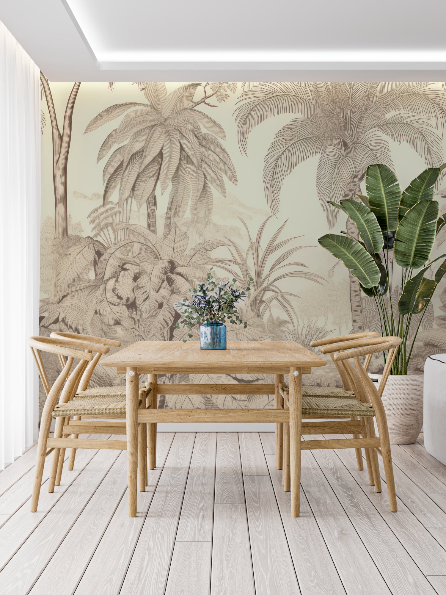 Denne tropiske jungel tapeten viser en elegant komposisjon av palmetrær og eksotisk løvverk gjengitt i sofistikerte beige toner. Det delikate linjearbeidet skaper dybde og dimensjon, med grasiøst tegnete palmeblader og frodig vegetasjon som kommer frem fra en myk, kremfarget bakgrunn. Natur veggmaleriet kombinerer kunstnerisk raffinement med botanisk detalj, og tilbyr en harmonisk blanding av tropiske elementer i en nøytral, allsidig palett.