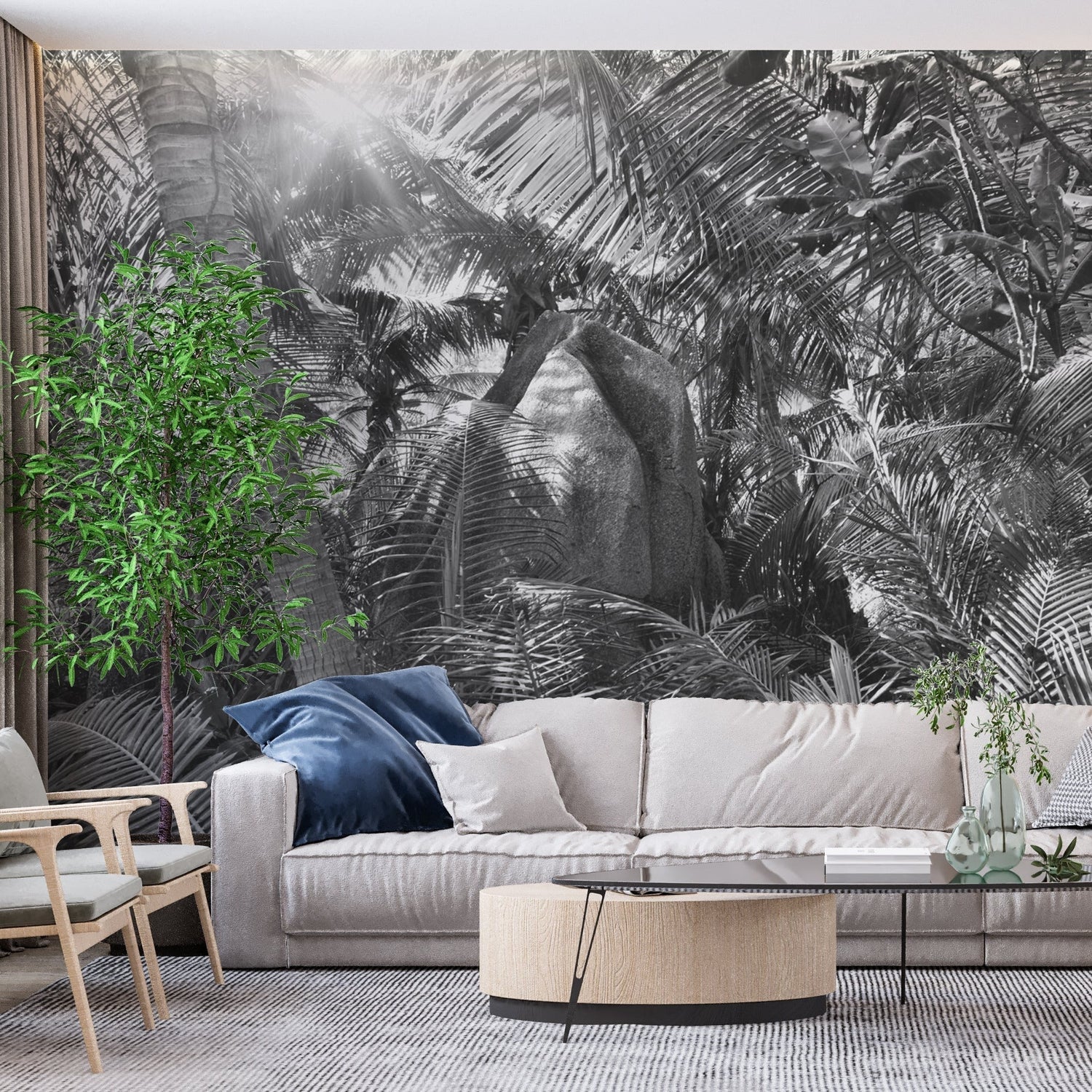 Forvandle ethvert rom til et sofistikert tilfluktssted med denne svart-hvite jungel tapeten. Enten den pryder et kontor, soverom eller oppholdsrom, tilfører denne palmeblader veggmaleriet dybde og arkitektonisk interesse samtidig som den opprettholder en atmosfære av moderne eleganse. Den monokromatiske paletten sikrer allsidighet, og lar den komplementere enhver interiørdesign samtidig som den skaper en følelse av ro og naturlig storhet.