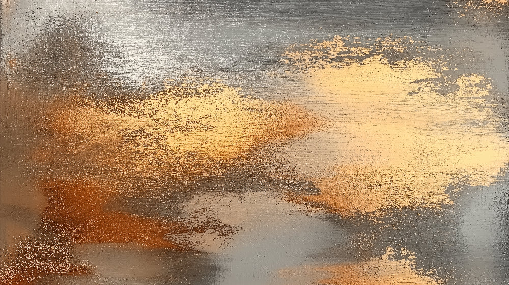 This abstract metallic wallpaper showcases a masterful interplay of gold and silver tones, creating a luxurious atmospheric effect. The textured surface features sweeping brushstrokes where warm golden hues blend seamlessly into cool grey foundations, producing a sophisticated contemporary wall mural that appears to shimmer and shift with changing light. Each detail reveals careful artistry in the way metallic accents catch and reflect illumination across the surface.