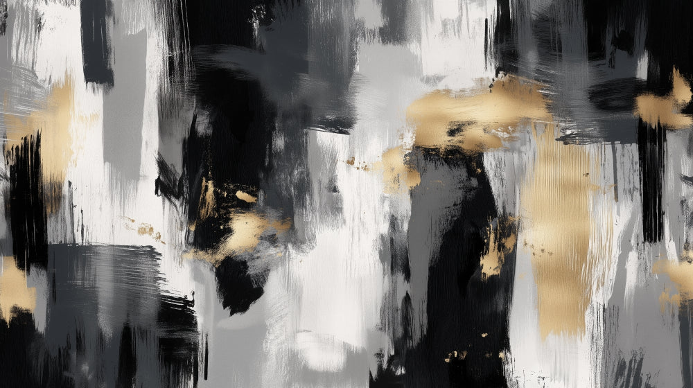 This abstract wall mural captures the essence of modern artistry through bold, expressive brushstrokes. Deep blacks blend seamlessly with pristine whites, while metallic gold accents create dramatic focal points throughout the composition. The dynamic contemporary wallpaper features sweeping gestural marks and textured applications that evoke the spontaneous energy of abstract expressionism.