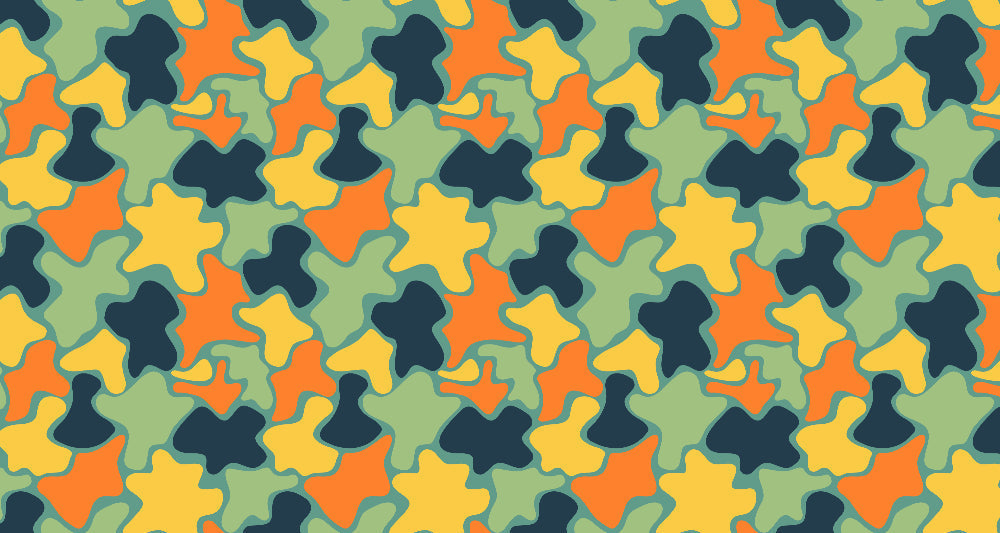 This abstract pattern wallpaper showcases a bold and dynamic composition of organic shapes in a modern camouflage-inspired design. The vibrant palette combines sage green, sunshine yellow, burnt orange, and deep navy in fluid, interlocking forms. Each geometric wallpaper element flows seamlessly into the next, creating a rhythmic pattern that captivates the eye while maintaining visual harmony.