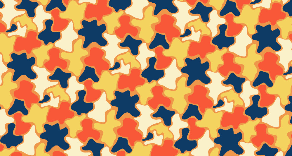 This abstract geometric wallpaper showcases a bold and dynamic pattern of interlocking organic shapes in a vibrant color palette. Navy-blue forms create depth against warm orange and yellow elements, while cream-colored shapes add subtle contrast to this modern pop art wallpaper. The flowing, puzzle-like composition creates a sense of movement and energy, with each shape seamlessly connecting to form a cohesive and rhythmic pattern.