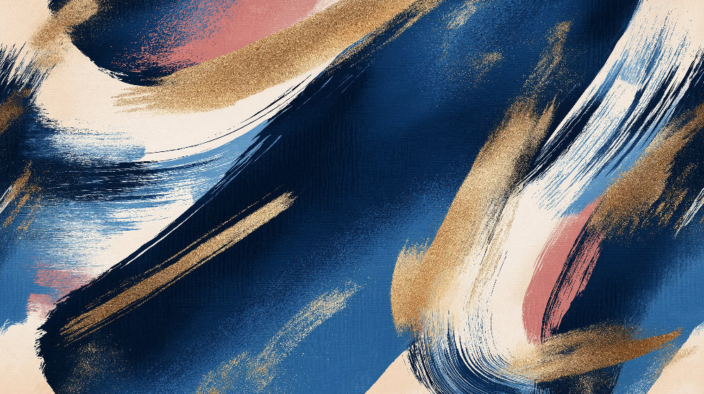 This abstract brushstroke wallpaper showcases a dynamic composition of sweeping strokes in rich navy blue, luminous gold, and delicate coral pink. The bold, artistic gestures create a sense of movement and energy, while the sophisticated blue and gold wallpaper palette maintains an air of refined elegance. Each brushstroke appears to dance across the surface, creating a harmonious interplay of color and texture that captures the essence of contemporary artistic expression.