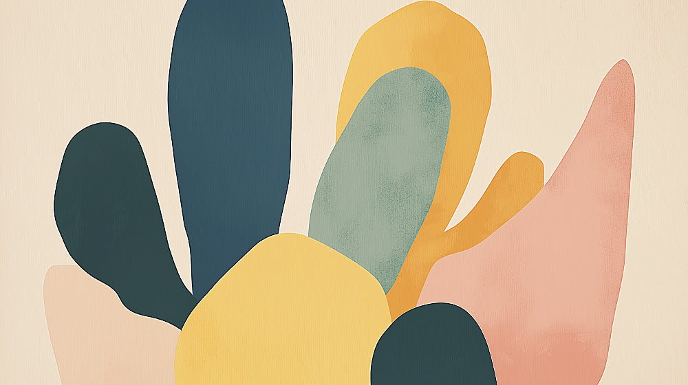This abstract wall mural showcases a harmonious composition of fluid, organic shapes that dance across a warm cream backdrop. The sophisticated palette combines deep forest green, mustard gold, and soft blush pink in gracefully curved forms, creating a modern abstract wallpaper that captivates with its gentle movement and balanced proportions. Each shape flows naturally into the next, forming an artistic arrangement that feels both contemporary and timeless.
