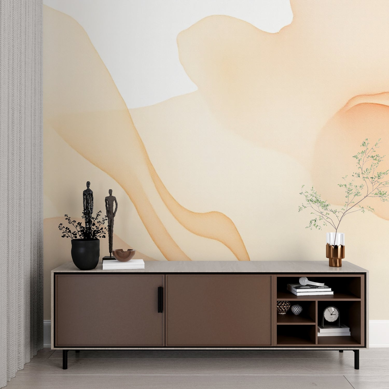 This abstract watercolor wallpaper brings a gentle sophistication to any space with its fluid, wave-like patterns in soft beige and cream tones. The delicate brushstrokes create an ethereal landscape of flowing forms, reminiscent of gentle sand dunes or morning mist. The subtle coral undertones add warmth to the minimalist wall mural, while maintaining an elegant, contemporary aesthetic.