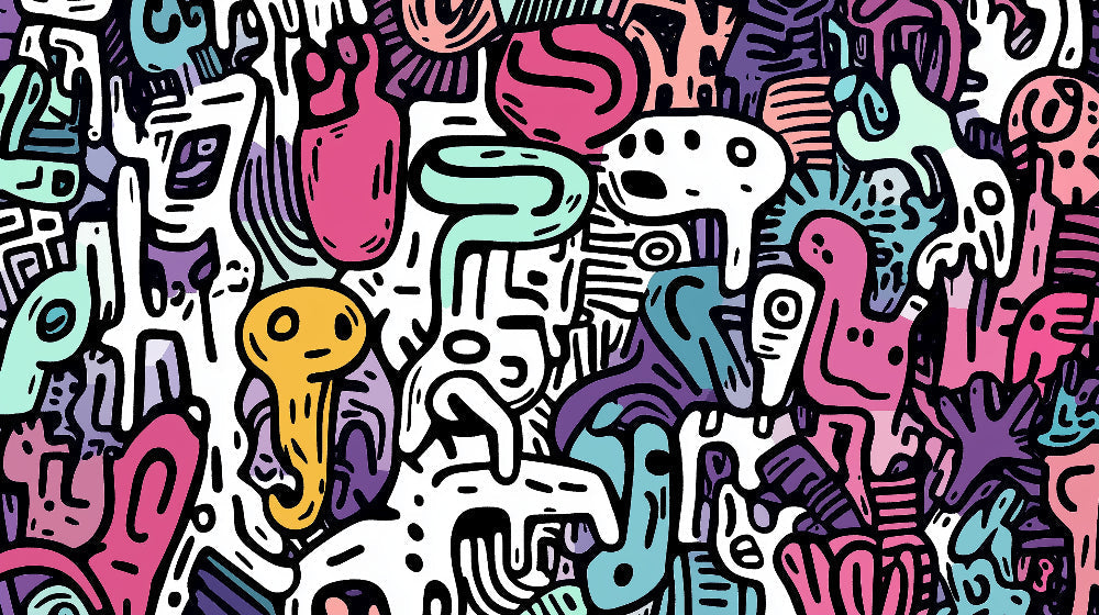 This abstract mural wallpaper showcases a vibrant urban composition filled with playful, interwoven shapes in a bold graffiti style. The dynamic design features a striking palette of mint-green, turquoise, pink, purple, and yellow elements against a crisp white background. Each street art wallpaper character seems to flow into the next, creating an energetic rhythm of curved lines and expressive forms that captivate the eye.