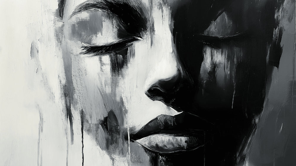 This abstract portrait wallpaper commands attention with its masterful interplay of light and shadow. Bold brushstrokes in contrasting black and white create a dramatic composition, where expressive features emerge from textured layers of paint. The monochrome wall mural captures raw emotion through its artistic interpretation, with sweeping strokes and deliberate drips adding depth and movement to the striking facial features.