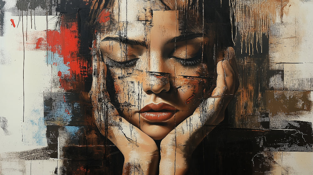 This abstract portrait wallpaper captures raw emotion through a masterful blend of artistic techniques. The composition features dramatic brushstrokes and textural elements, where rich terracotta tones merge with deep blacks and subtle blues. The contemporary art wallpaper showcases a striking portrait with delicate features emerging from layers of paint-like effects, creating an immersive visual experience that commands attention.