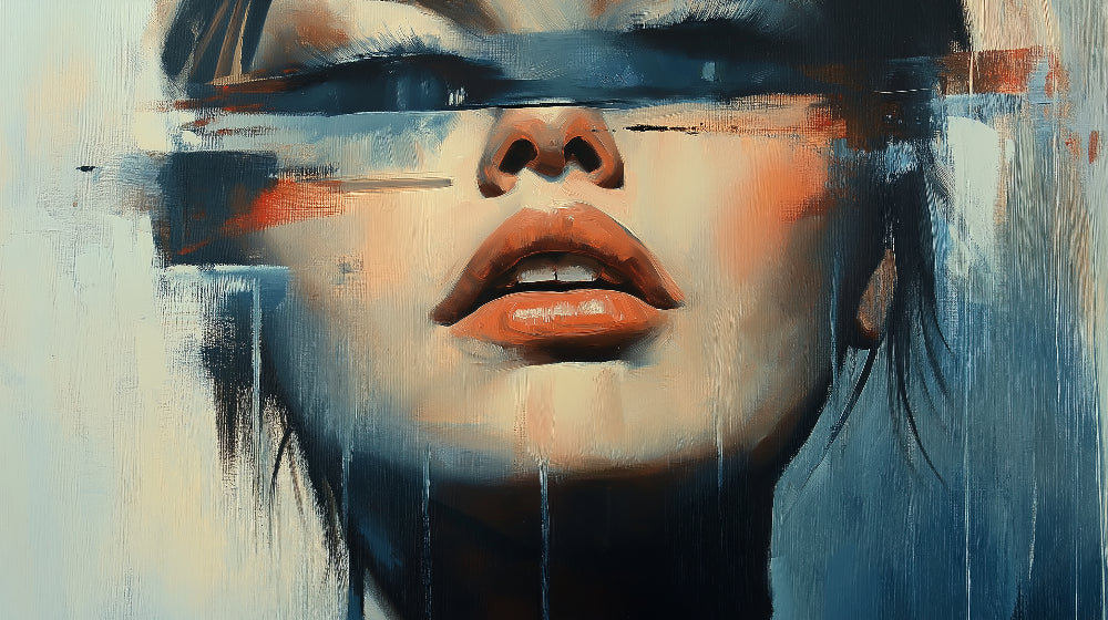 This abstract portrait wallpaper showcases a striking artistic composition where contemporary expression meets raw emotion. The mesmerizing blend of deep teal-blue shadows and warm terracotta tones creates a powerful focal point, while bold brushstrokes and deliberate drips add dynamic movement to the modern portrait mural. The ethereal quality of the painting technique brings forth a sense of mystery and sophistication.
