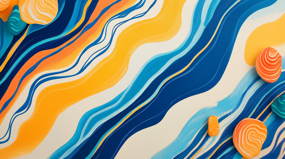 This abstract wave wallpaper creates a mesmerizing visual rhythm through fluid, undulating lines that dance across the wall. The dynamic composition features bold strokes of deep navy blue and turquoise waters flowing alongside warm golden yellow and vibrant orange bands, all balanced by crisp white spaces. The modern wave mural showcases an artistic interplay of cool and warm tones, creating a sense of natural movement and energy.