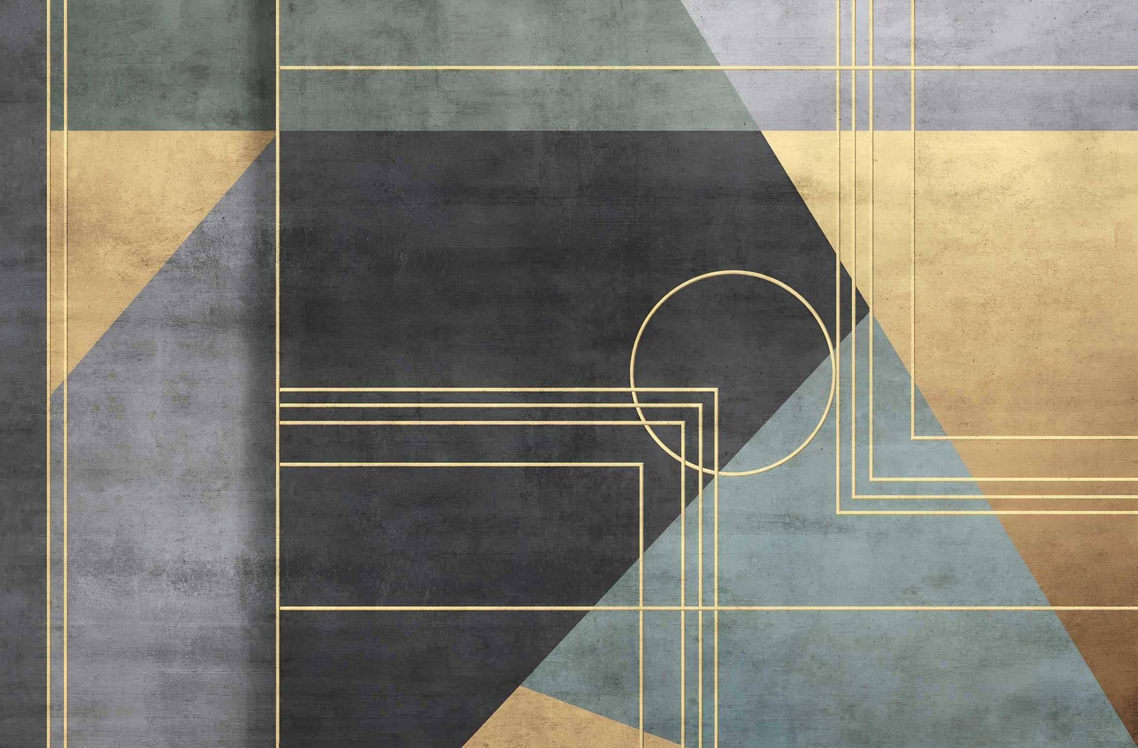 This geometric art deco wallpaper showcases a sophisticated interplay of charcoal grey, sage green, and metallic gold elements. The striking design features clean lines, bold angular shapes, and graceful circular motifs that create a harmonious composition reminiscent of the art deco style wallpaper. Delicate golden lines weave throughout the pattern, adding luxurious detail while connecting the various geometric forms in an elegant dance of proportion and balance.