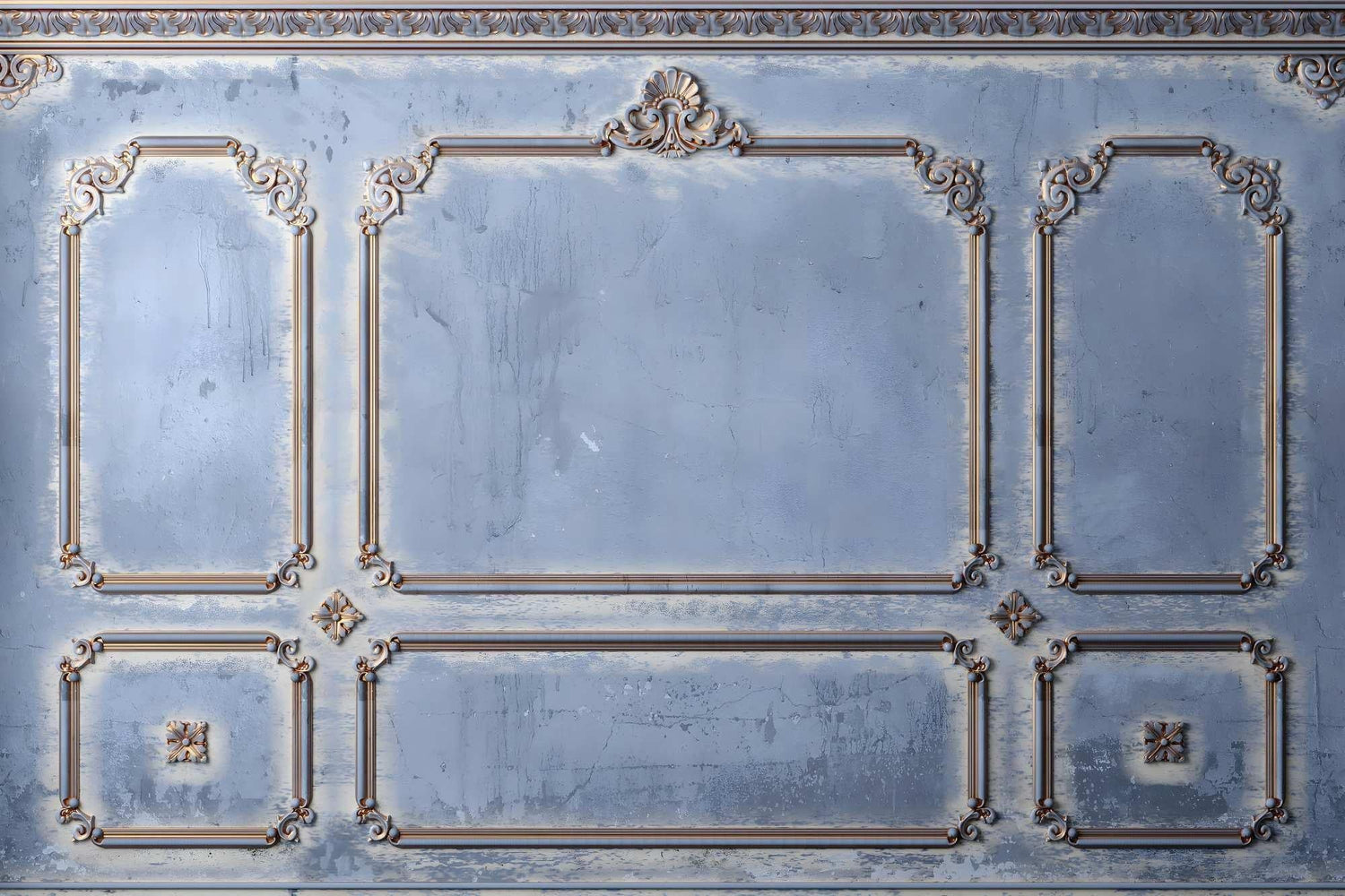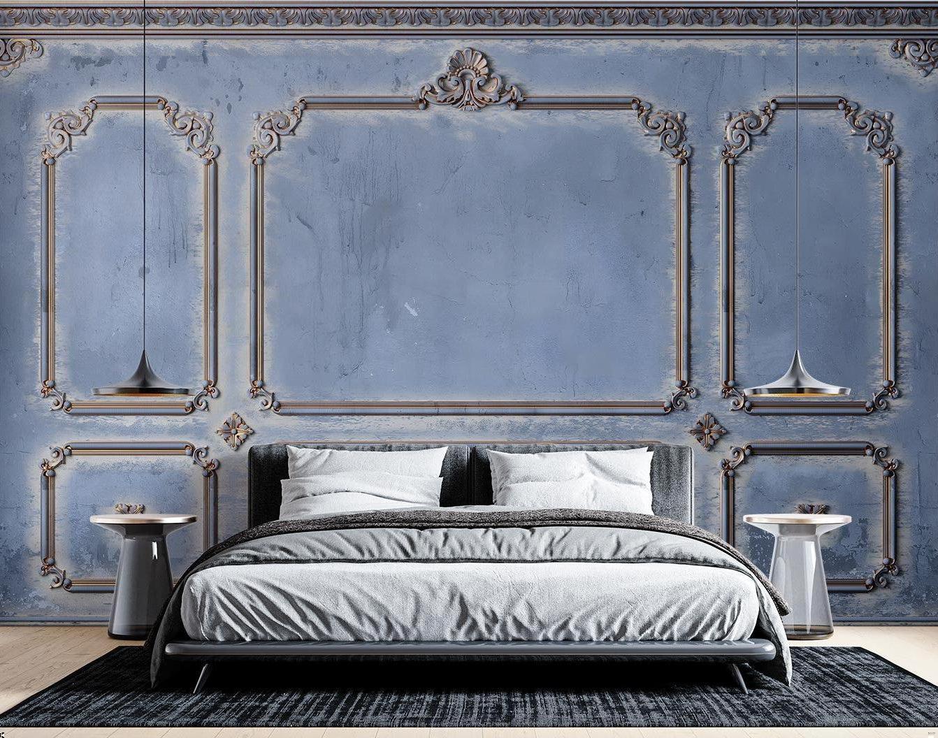 This sophisticated art deco wall mural showcases exquisite architectural details with ornate moldings set against a serene blue-grey backdrop. The hand-crafted appearance of the classical frames creates an authentic period aesthetic, while the delicate scrollwork and decorative corner elements add refined French classical wallpaper charm. The weathered patina effect brings depth and character to the stone-like surface, creating an atmosphere of timeless elegance.