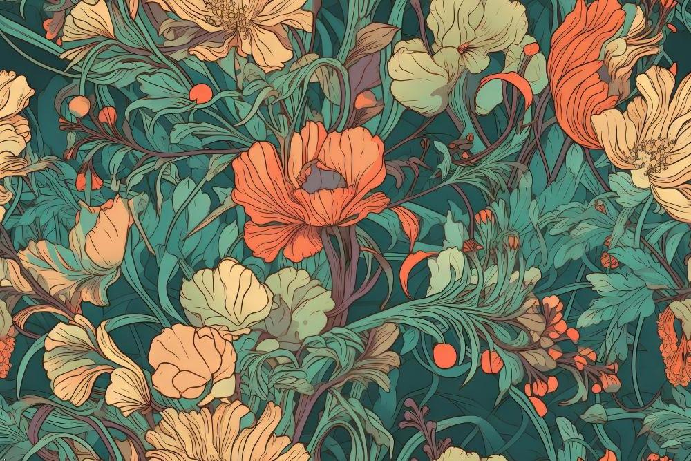 Art Nouveau Mural Wallpaper | Coral and Green Floral Pattern