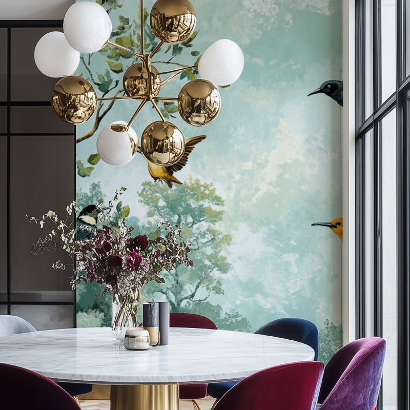 This mint green bird wallpaper turns rooms into peaceful hideaways.