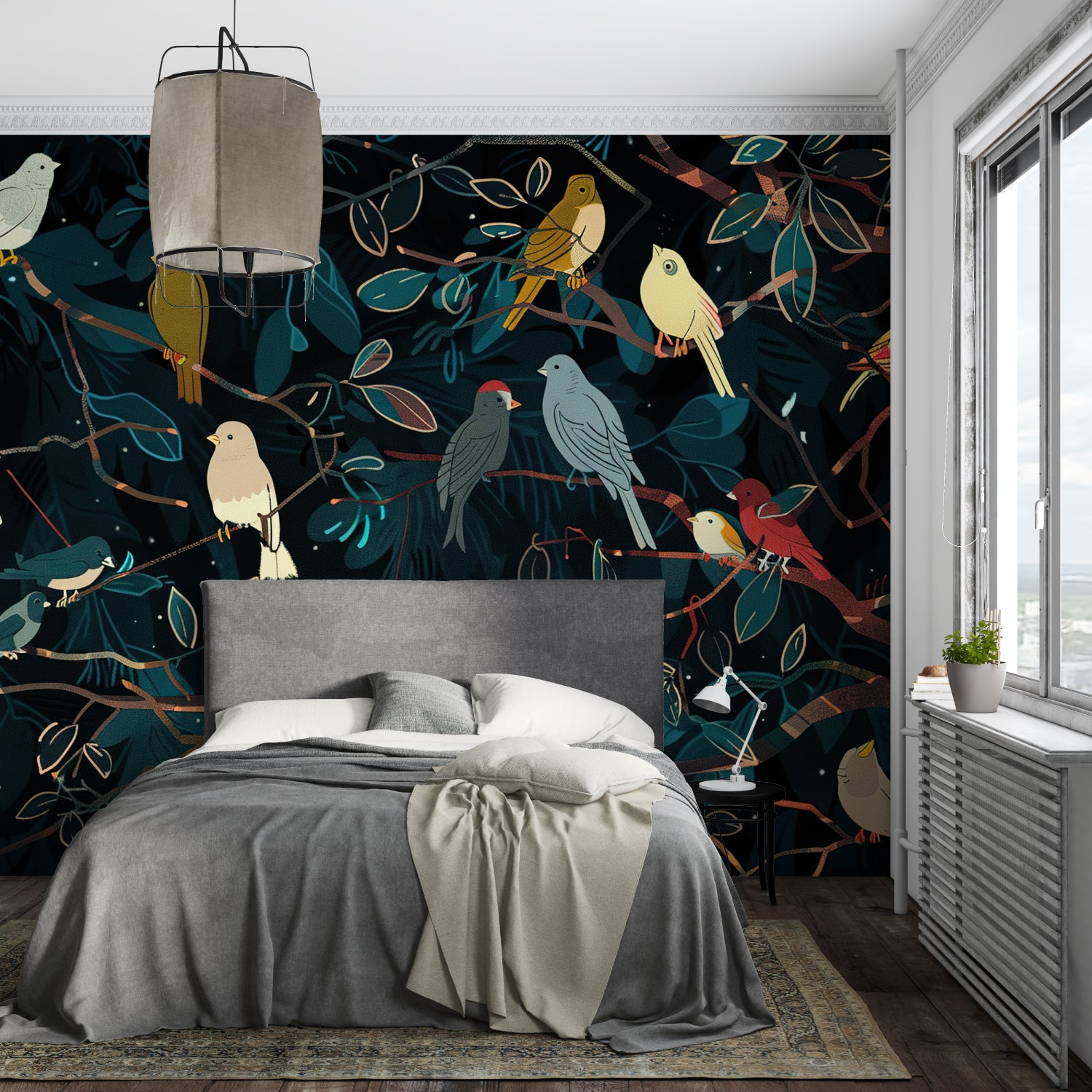 Birds Mural Wallpaper | Night Forest with Colorful Birds