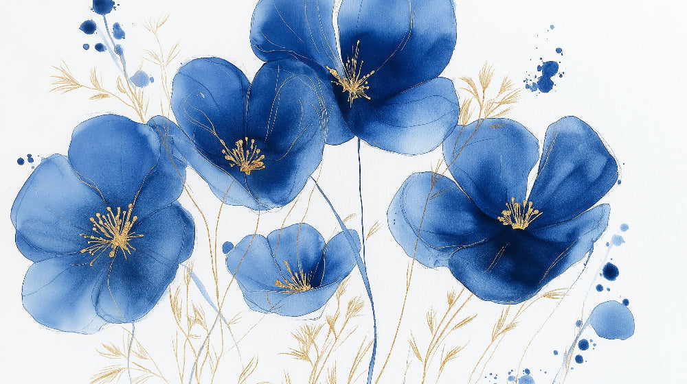 This watercolor floral wallpaper showcases graceful blue poppies dancing across a pristine white backdrop. Each bloom is masterfully rendered with translucent layers of rich azure and cobalt, creating a sense of depth and movement. Delicate golden stamens and wispy stems add an elegant metallic accent, while subtle splashes and organic shapes bring artistic spontaneity to this blue floral mural.