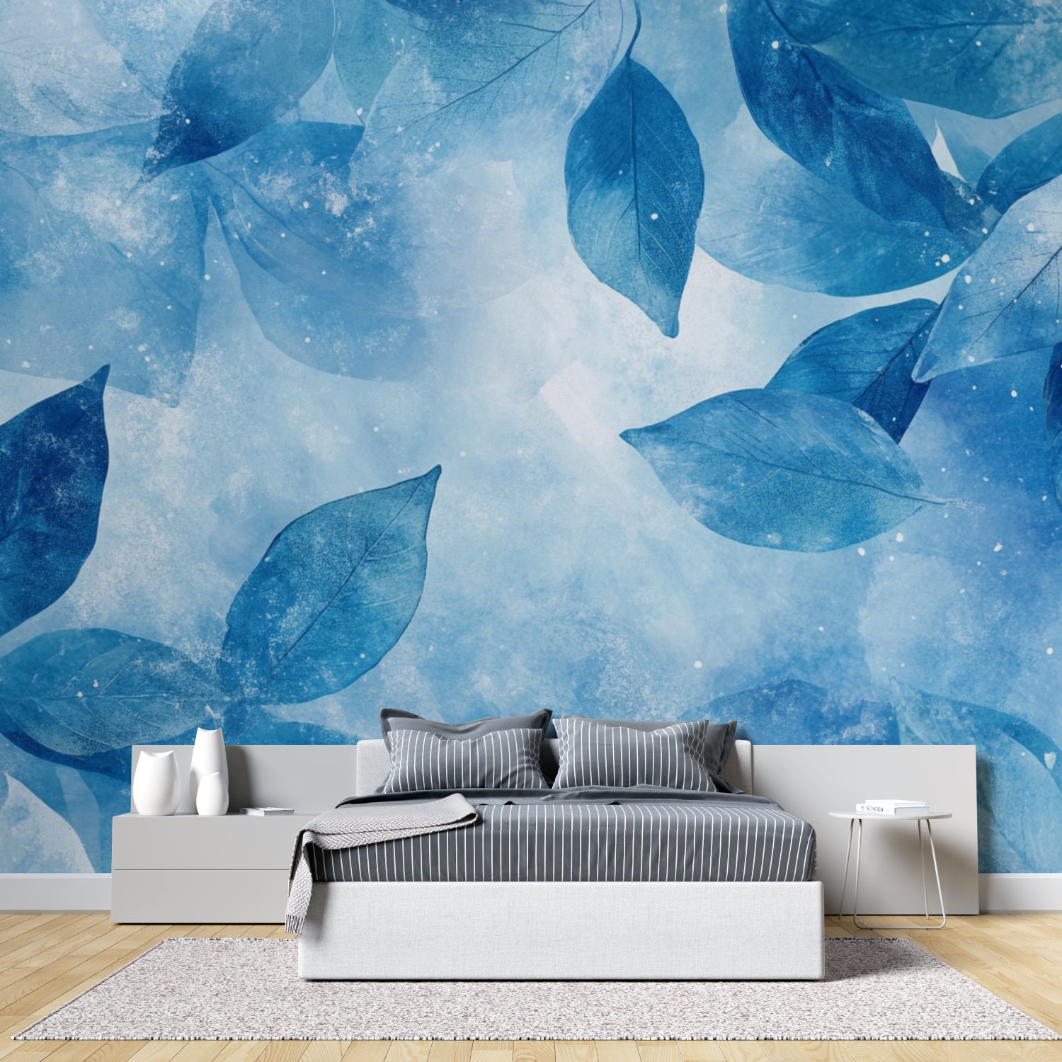 Transform your space with this modern blue leaf mural that brings a sense of serenity and artistic sophistication to any interior. The watercolor foliage wallpaper creates an atmosphere of tranquil elegance, making it an ideal choice for spaces where you seek to combine contemporary design with natural elements. Whether in a dining area or bedroom, this design infuses rooms with a calm, refreshing ambiance while maintaining a strong decorative presence.