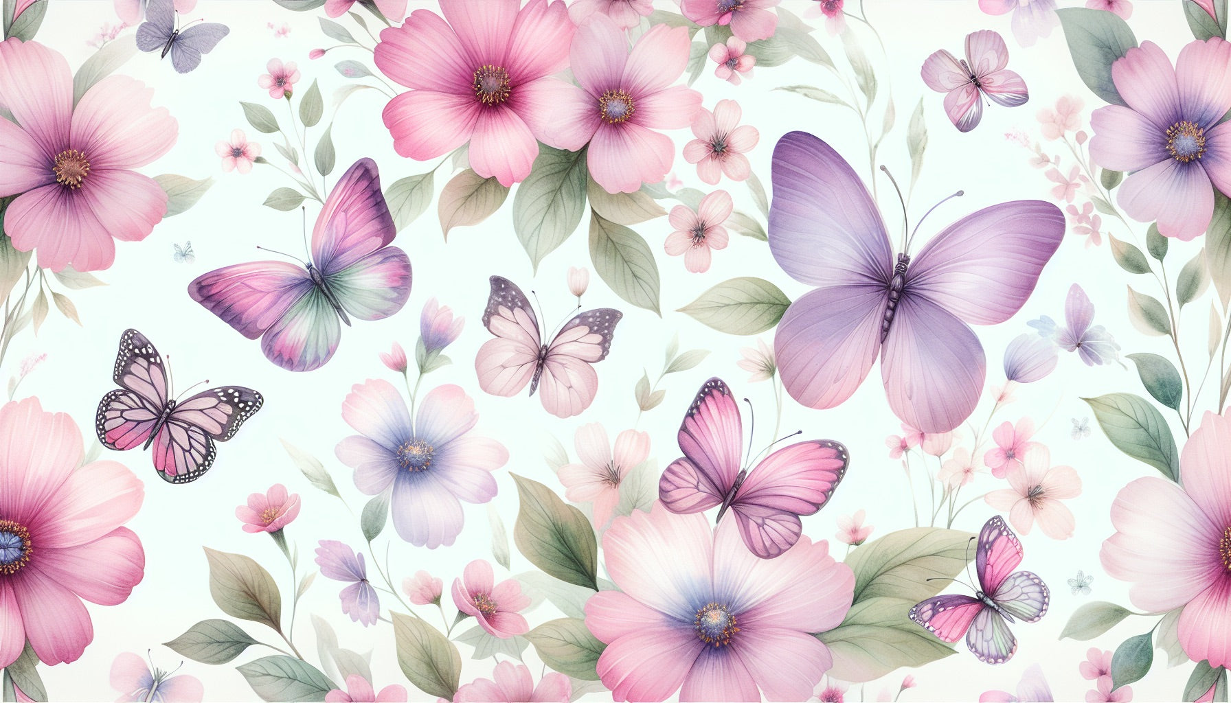 This butterfly and flower wallpaper creates an enchanting garden scene with delicate butterflies dancing among blooming flowers. The design features graceful butterflies in shades of pink and purple, their wings detailed with subtle gradients and intricate patterns. Soft pink blossoms with deep centers are complemented by sage-green leaves, while smaller purple flowers add depth to this floral butterfly wallpaper composition.