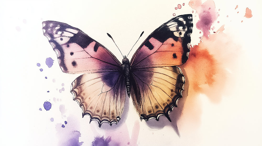 This butterfly wall mural showcases an enchanting watercolor composition where nature meets artistry. The centerpiece butterfly emerges in a stunning gradient of purple, pink, and orange hues, set against a pristine backdrop. Delicate watercolor splashes in violet and coral tones dance around the wings, while the intricate wing patterns display a masterful blend of light and shadow, creating a sophisticated interplay of colors.