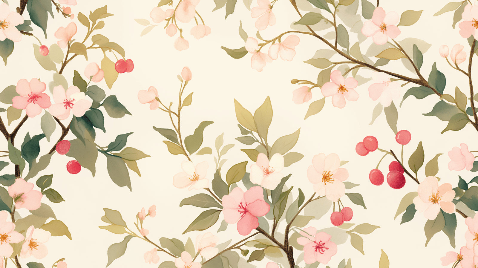 This cherry blossom wallpaper presents an enchanting botanical composition where delicate pink blossoms dance among olive-green foliage on a warm ivory background. The watercolor-style petals create a soft, dreamy atmosphere, while bright red berries add unexpected pops of color to this floral mural wallpaper. Each branch flows with natural grace, creating a harmonious pattern that captures the essence of springtime elegance.