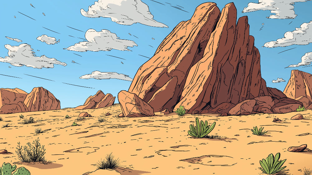 This desert landscape wallpaper captures the raw beauty of towering sandstone formations against a vibrant blue sky dotted with wispy clouds. The artistic illustration style brings out the rich terracotta and golden hues of the rugged rock formation wallpaper, while scattered cacti and desert vegetation add authentic touches of sage green to the sandy terrain. The composition creates a sense of grand scale and natural majesty, with each geological detail carefully rendered.