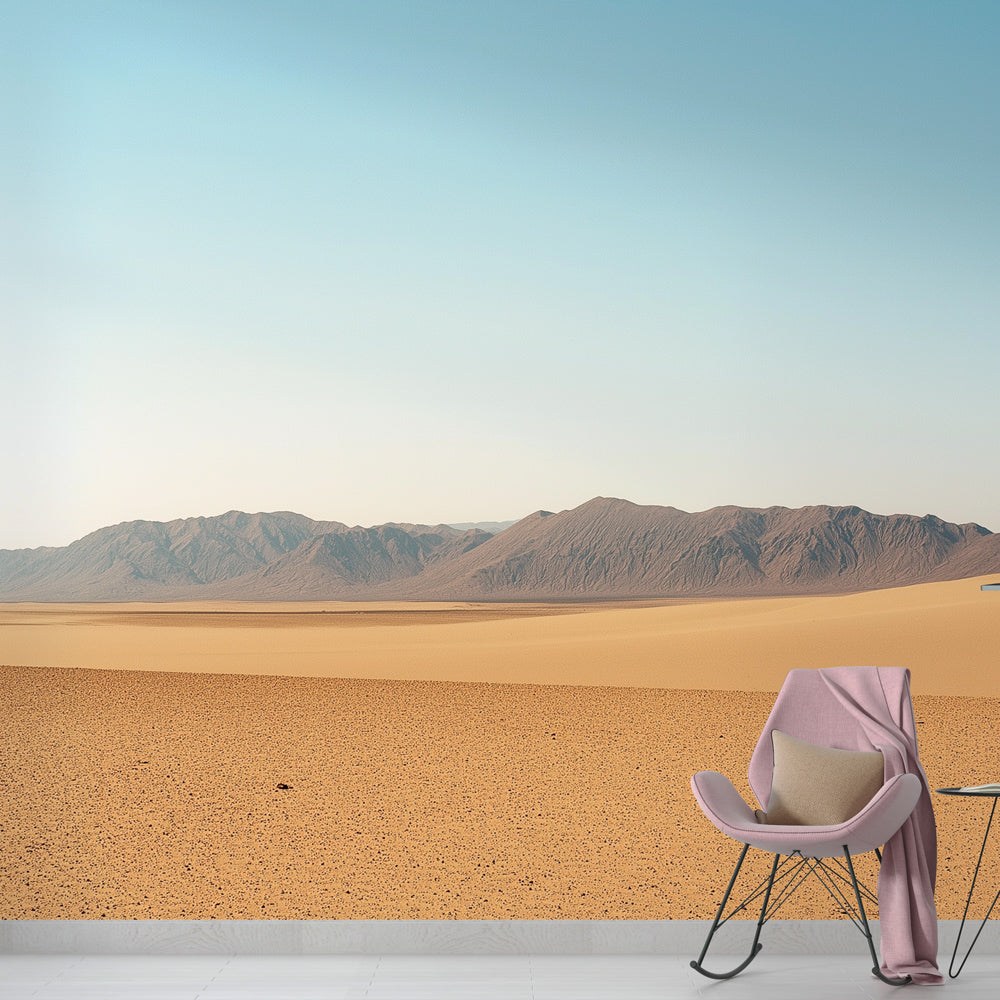 This desert landscape wallpaper captures the essence of nature's most serene vistas, where golden-hued plains stretch endlessly toward distant mountains. The composition balances warm terracotta sands against a soft blue sky, creating a harmonious panorama that speaks of vast open spaces. The minimalist desert mural showcases the subtle interplay of light and shadow across rolling dunes, offering a masterclass in natural geometry and earthen tones.