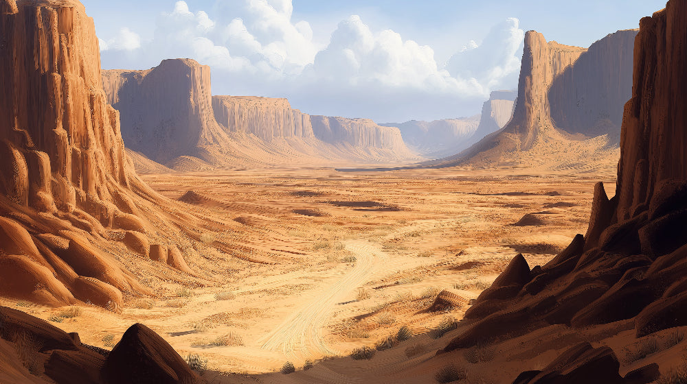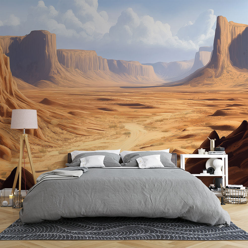 This desert landscape wallpaper captures the raw majesty of nature's grand architecture, where towering sandstone buttes rise dramatically from the sun-baked valley floor. The warm terracotta cliffs cast long shadows across the desert valley mural, while wispy clouds drift across the azure sky, creating a scene of untamed beauty. The natural color palette of golden-browns and soft beiges transitions seamlessly through the composition, offering depth and perspective that draws the eye into the vast landscape.