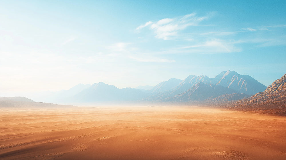 This desert landscape wallpaper captures the raw beauty of an untamed wilderness where golden-hued dunes meet towering mountain peaks. The composition masterfully balances the warm terracotta sands stretching endlessly toward the horizon with the misty-blue mountain range rising majestically against a serene panoramic sky wallpaper. The ethereal morning light bathes the scene in soft, dream-like qualities, creating an atmosphere of profound tranquility.